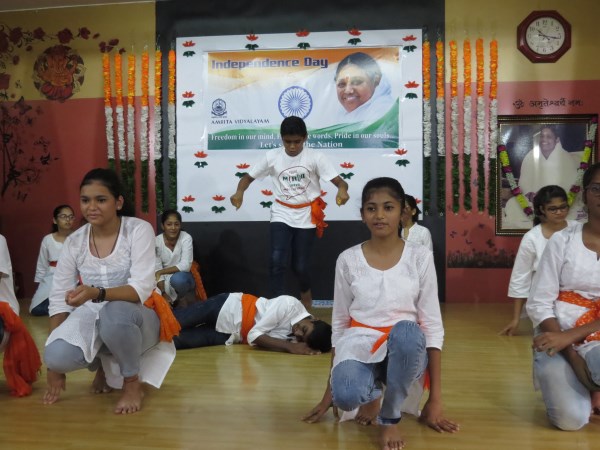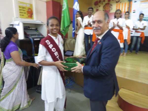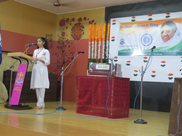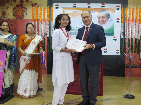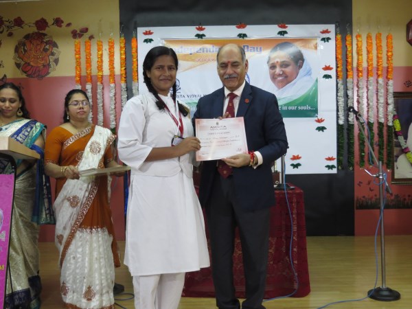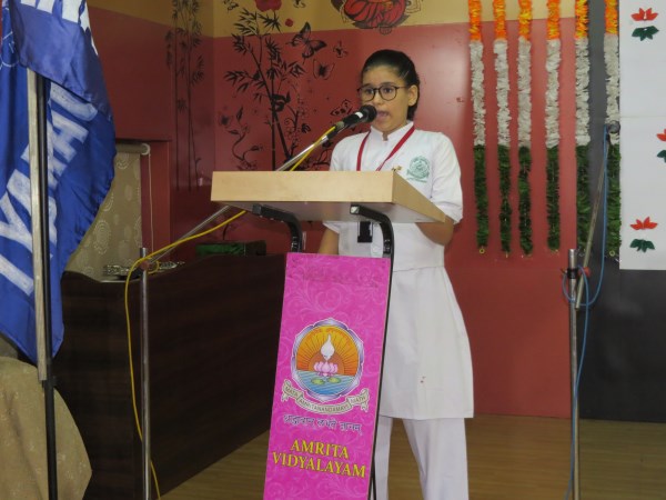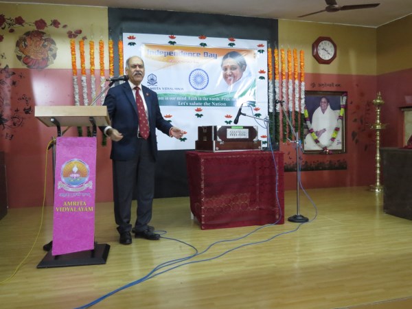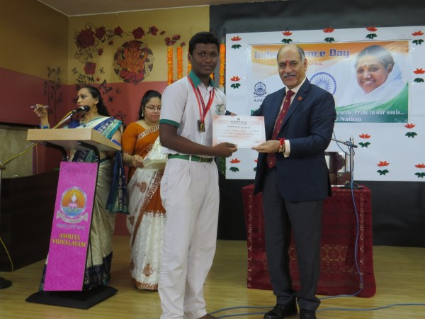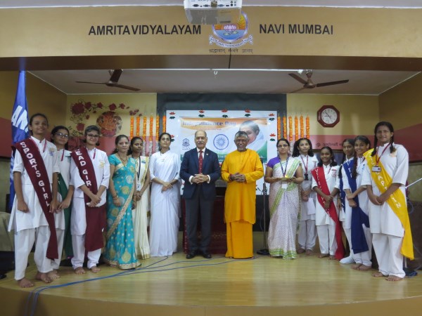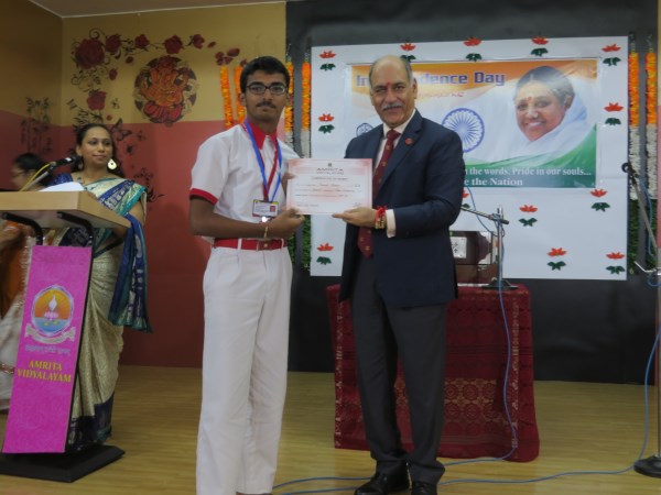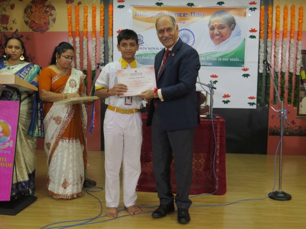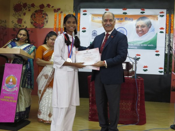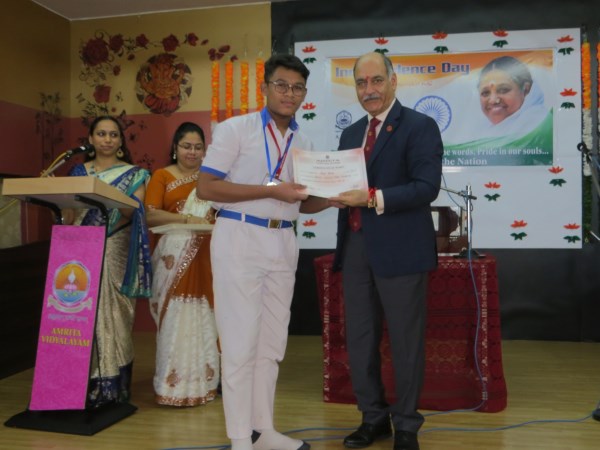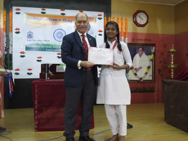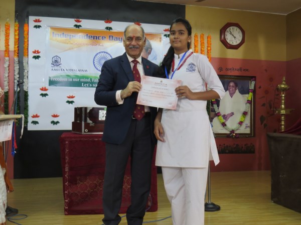 “Simple living is the key in the pursuit of happiness” said Brig. Bhasin and connected instantly with the students by his energetic speech which made the students to ponder on 3 important values viz. Freedom should not be taken for granted, simple living is the key to happiness and self discipline is utmost important for self-development. Swamiji used an apt Sanskrit shloka and shared his life experiences to expand on the same thoughts. 2 patriotic songs, a speech in English by Nidhi Shetty and a Road Safety skit”Hamaari Suraksha Hamaari Haathon Mein” depicted the importance of “Safety First”. All the programmes received a lot of applause and appreciation by the Guests and the students. Brig. Bhasin felicitated the winners of Amrita Fest (VII-X) by giving them certificates and medals.