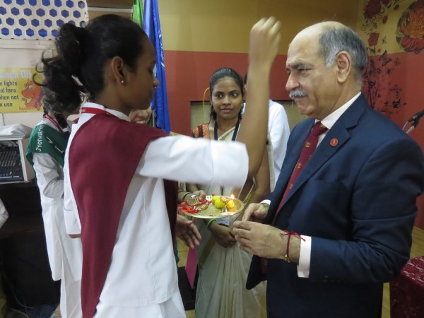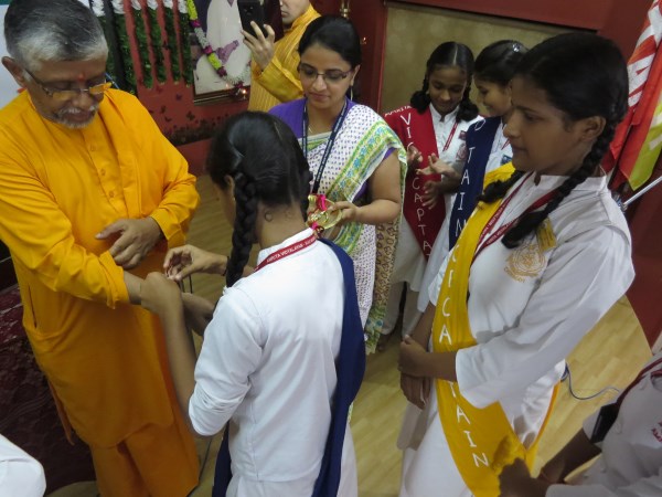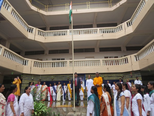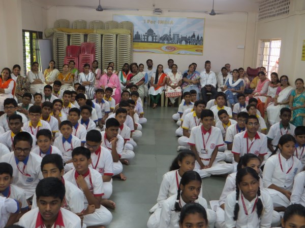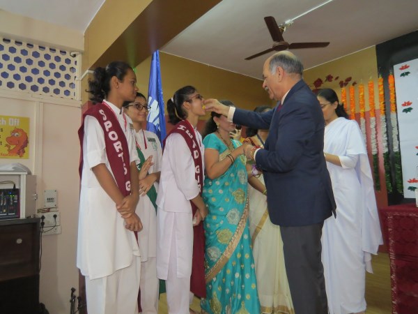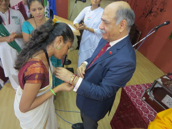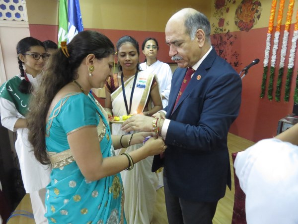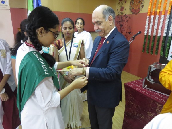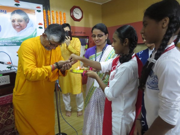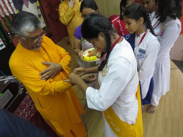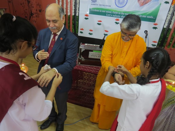 The celebrations started with the unfurling of the tricolor by Brigadier Shushil Basin, which was followed by the National Anthem. Principal Brni.Rekha introduced the guest. To celebrate the auspicious occasion of Raksha Bandhan, a few teachers and our student leaders tied Rakhis to the wrists of Swamiji and the Chief Guest, did Aarti, gave sweets and sought their blessings. It was indeed a joyous moment.