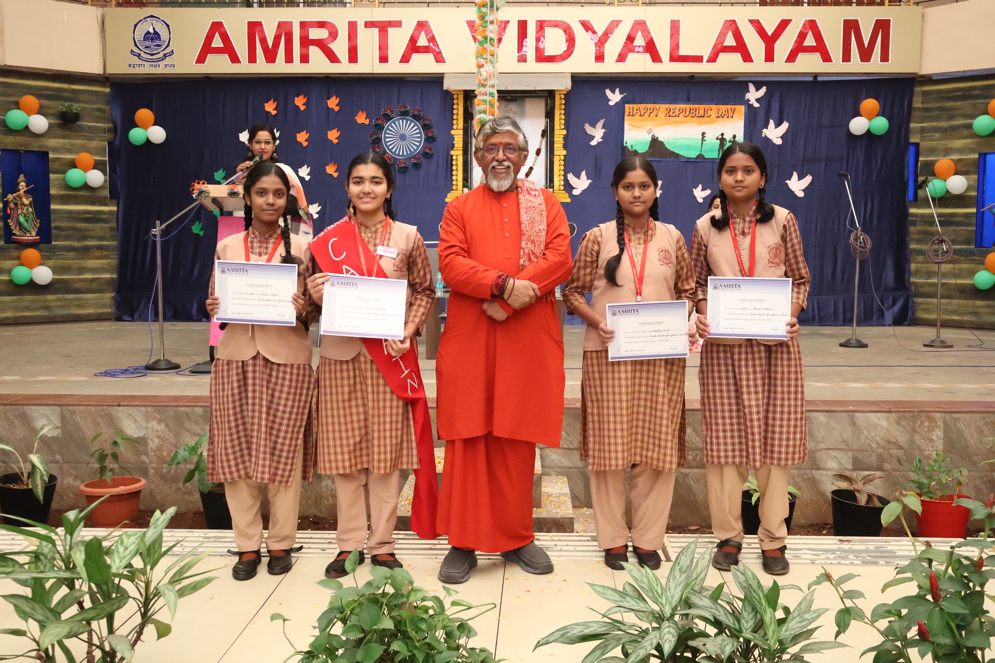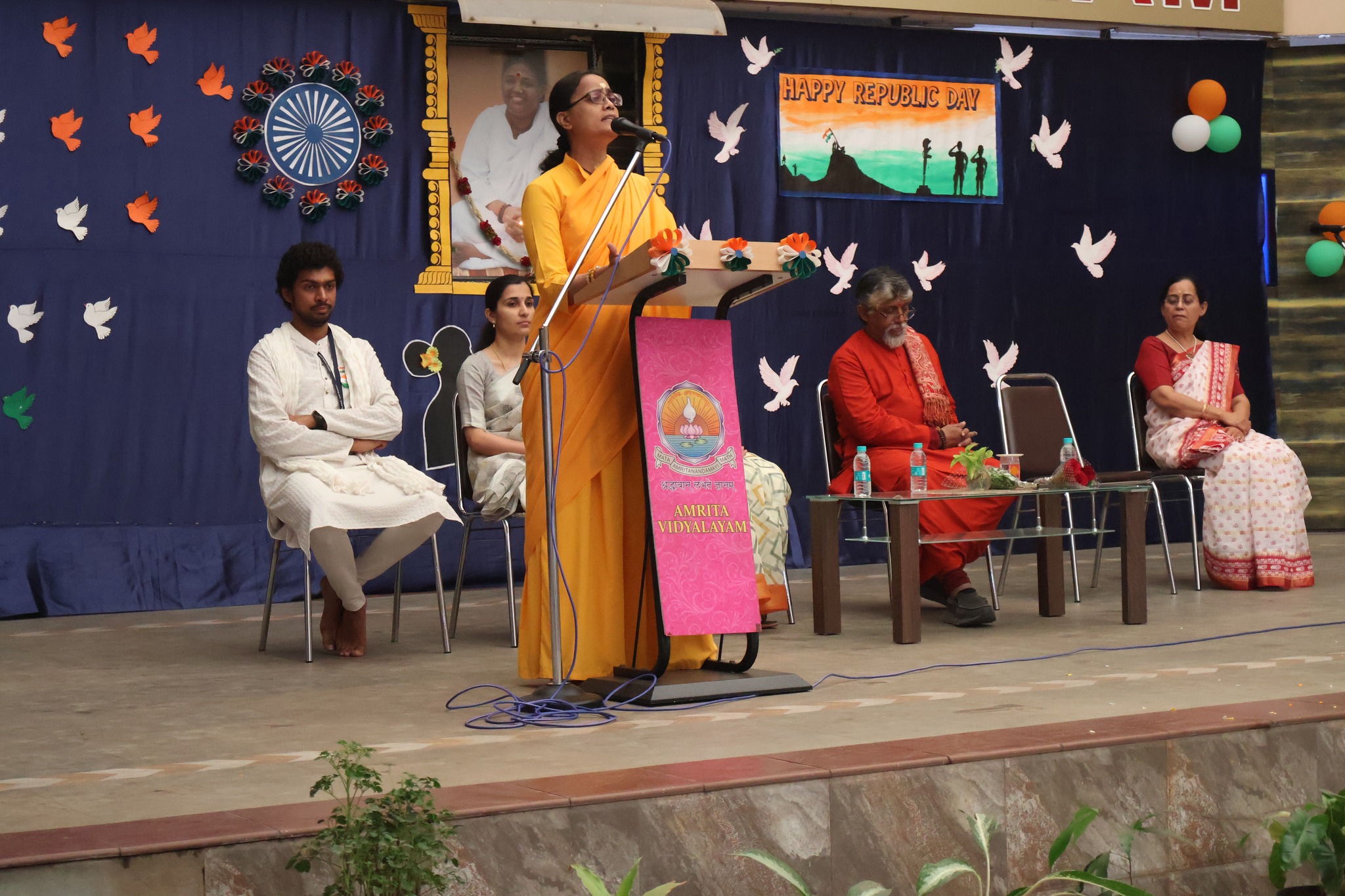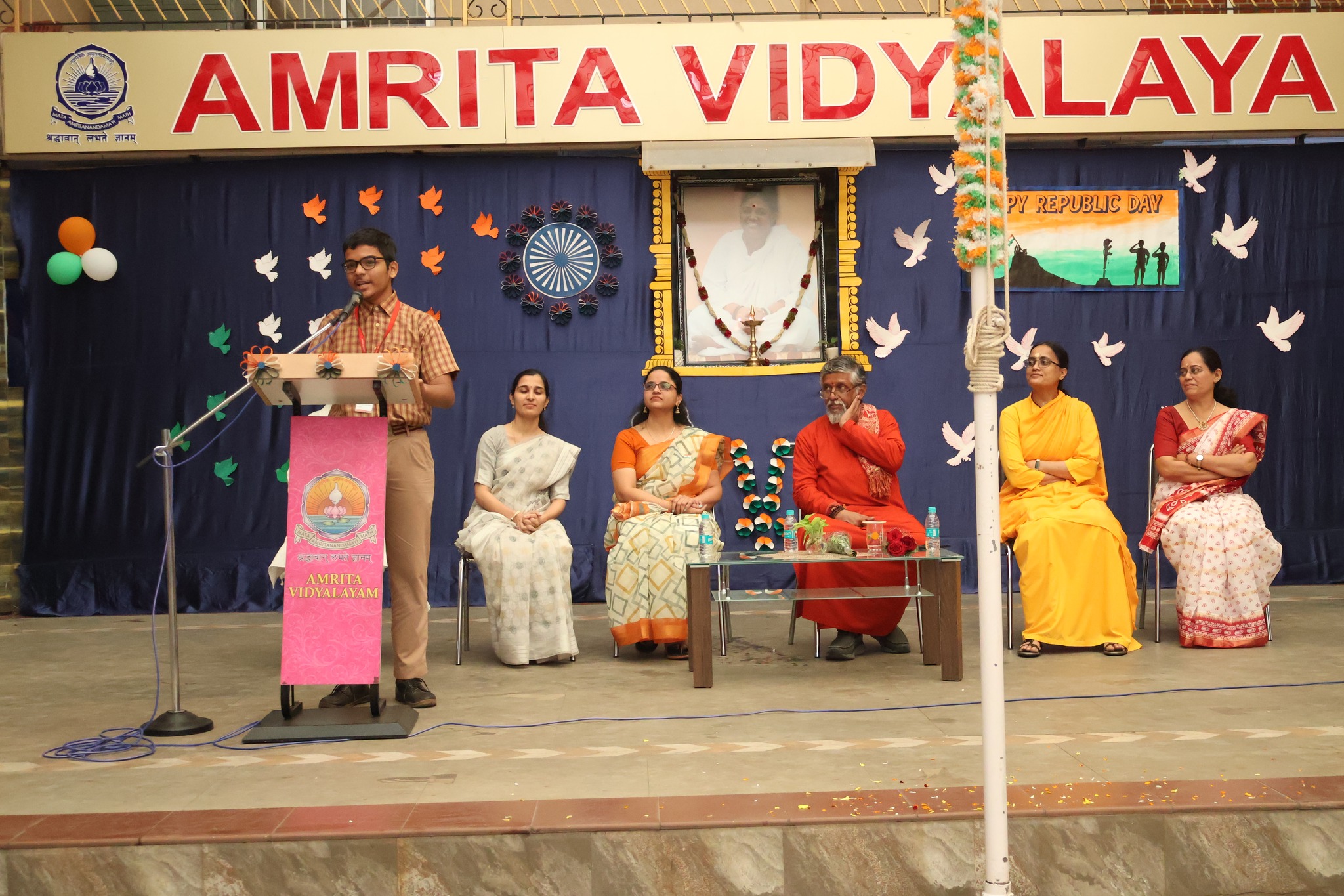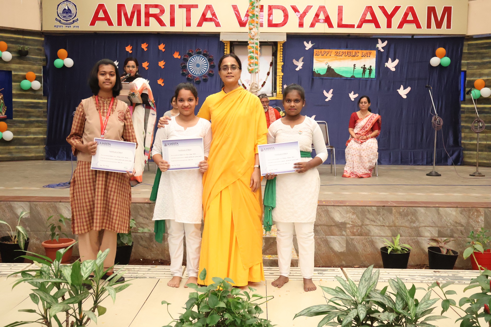 26th January is a day of national rejoice and is celebrated with zeal and spirit throughout the Country. 75th Republic day was celebrated with great enthusiasm in the school. The school atrium was decorated with handmade posters, balloons, wall hangings and tricolour pigeons symbolising peace and harmony. Bri. Avyayamritananda Puri, InCharge of Mata Amritanandamayi Math, Nerul graced the occasion and unfurled the National flag. He blessed the students with his words of wisdom. He narrated the incidents of humanity and compassion which has made the culture of India so distinct and popular. Administrator Brni. Sharanyamrita Chitanyaji addressed the students. She started with a melodious rendition of the famous Bhajan – Raghupati Raghav Rajaram. She explained how habits turns into character if we consistently follow some practice. She explained how we can contribute to the nation positively. Student Ayush Chavan of class 9 expressed his views about the independence struggle and our role and responsibility as citizens of India. Winners of Annual Science Exhibition- Vijana Sarathi were given away the certificates. No celebration is complete without song and dance. School choir team presented a melodious patriotic song. Students of class 7 and 8 presented an energetic Lezim dance to the rhythmic beat of drums. Program ended with the thanksgiving to the students, teachers and all invited guests for their contribution, cooperation and efforts to make the event successful.
