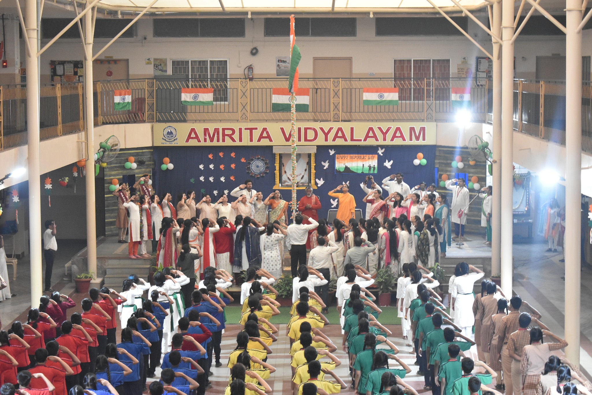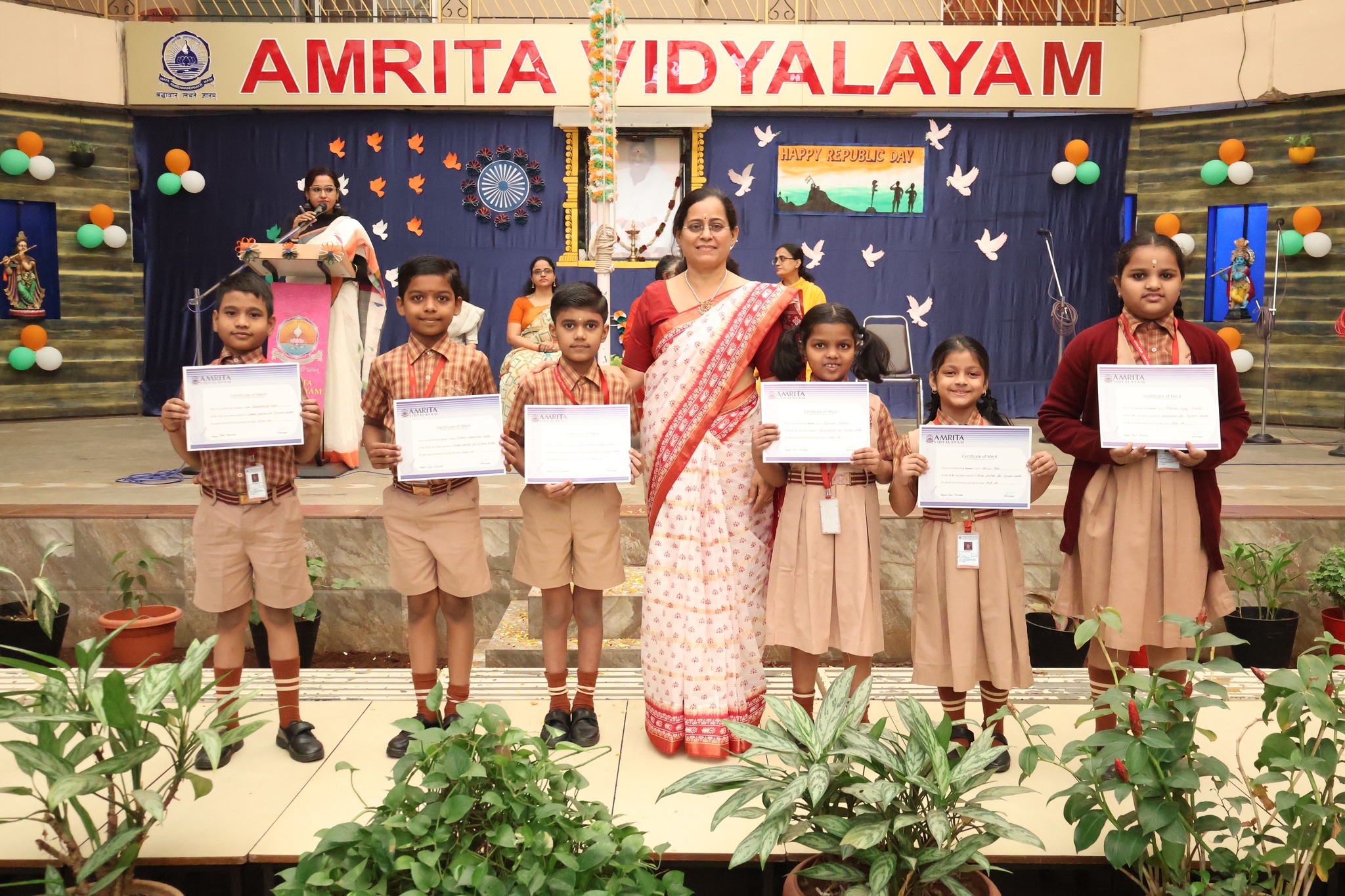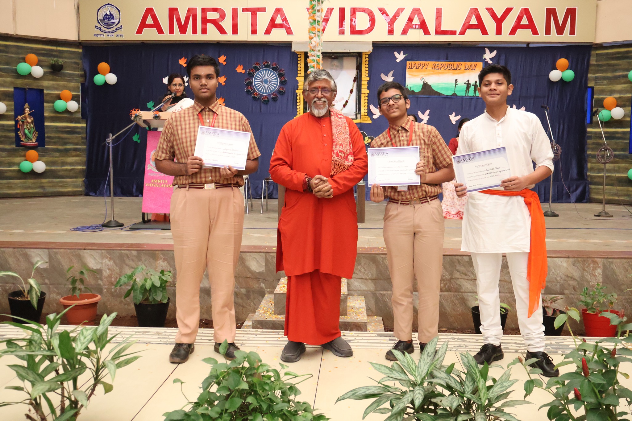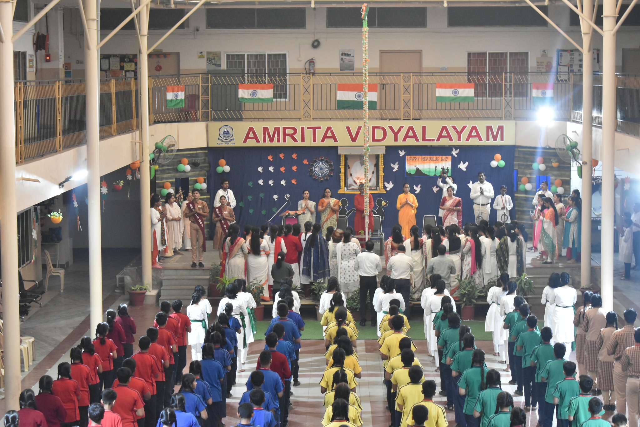 26th January is a day of national rejoice and is celebrated with zeal and spirit throughout the Country. 75th Republic day was celebrated with great enthusiasm in the school. The school atrium was decorated with handmade posters, balloons, wall hangings and tricolour pigeons symbolising peace and harmony. Bri. Avyayamritananda Puri, InCharge of Mata Amritanandamayi Math, Nerul graced the occasion and unfurled the National flag. He blessed the students with his words of wisdom. He narrated the incidents of humanity and compassion which has made the culture of India so distinct and popular. Administrator Brni. Sharanyamrita Chitanyaji addressed the students. She started with a melodious rendition of the famous Bhajan – Raghupati Raghav Rajaram. She explained how habits turns into character if we consistently follow some practice. She explained how we can contribute to the nation positively. Student Ayush Chavan of class 9 expressed his views about the independence struggle and our role and responsibility as citizens of India. Winners of Annual Science Exhibition- Vijana Sarathi were given away the certificates. No celebration is complete without song and dance. School choir team presented a melodious patriotic song. Students of class 7 and 8 presented an energetic Lezim dance to the rhythmic beat of drums. Program ended with the thanksgiving to the students, teachers and all invited guests for their contribution, cooperation and efforts to make the event successful.