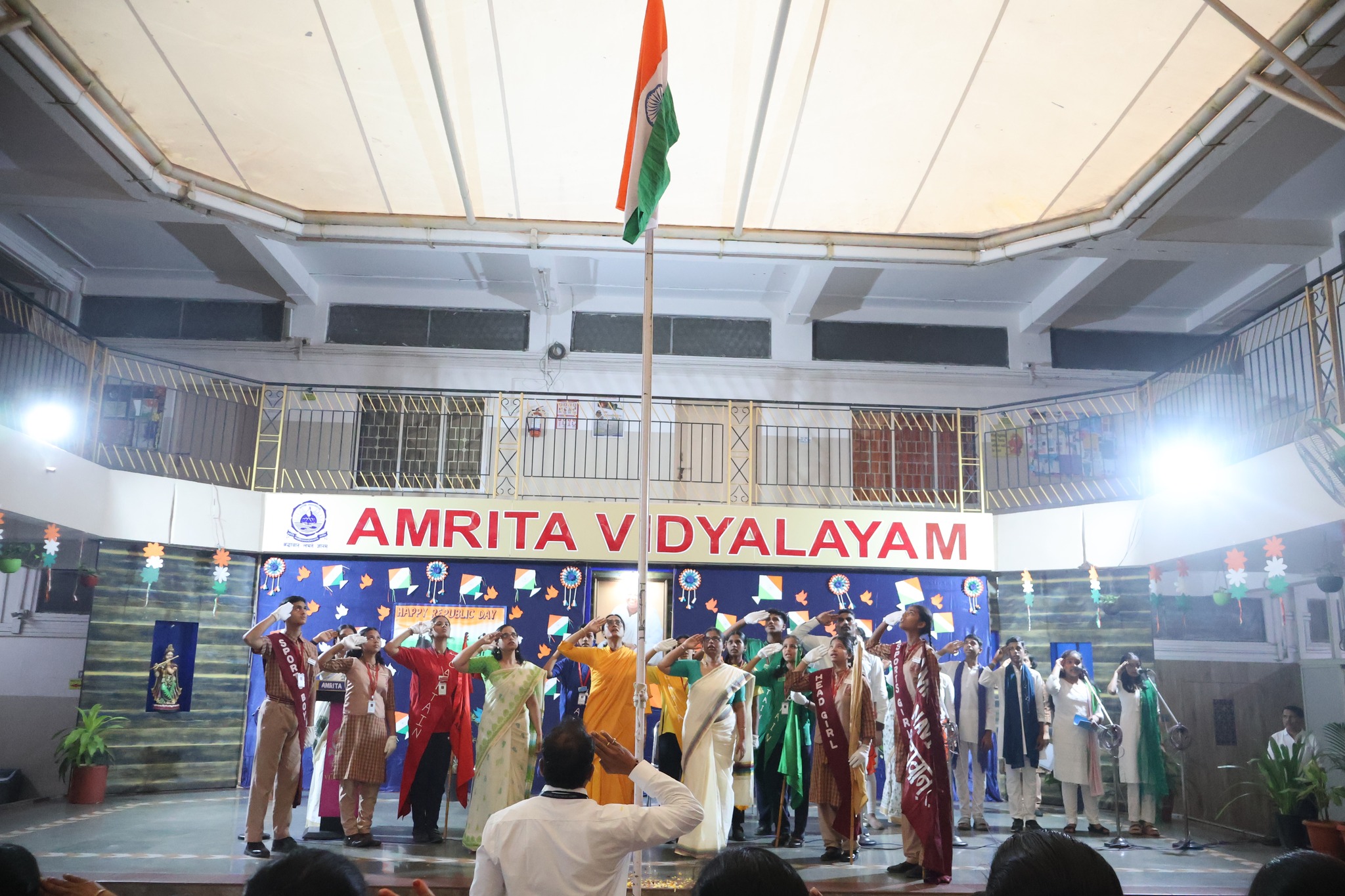 The 77th Republic Day was celebrated with great pride and patriotism at Amrita Vidyalayam, Navi Mumbai. The programme began with the auspicious lighting of the lamp, followed by a soulful prayer invoking divine blessings. Aditi Dipak warmly welcomed our respected Principal Ma’am, after which the National Flag was hoisted with honour and dignity. The atmosphere resonated with unity and pride during the National Anthem, followed by an inspiring speech by Parineeta of class 7th Standard and a deeply motivational address by our Principal Ma’am. The celebration concluded peacefully with the chanting of the Shanti Mantra, leaving everyone inspired and reflective.