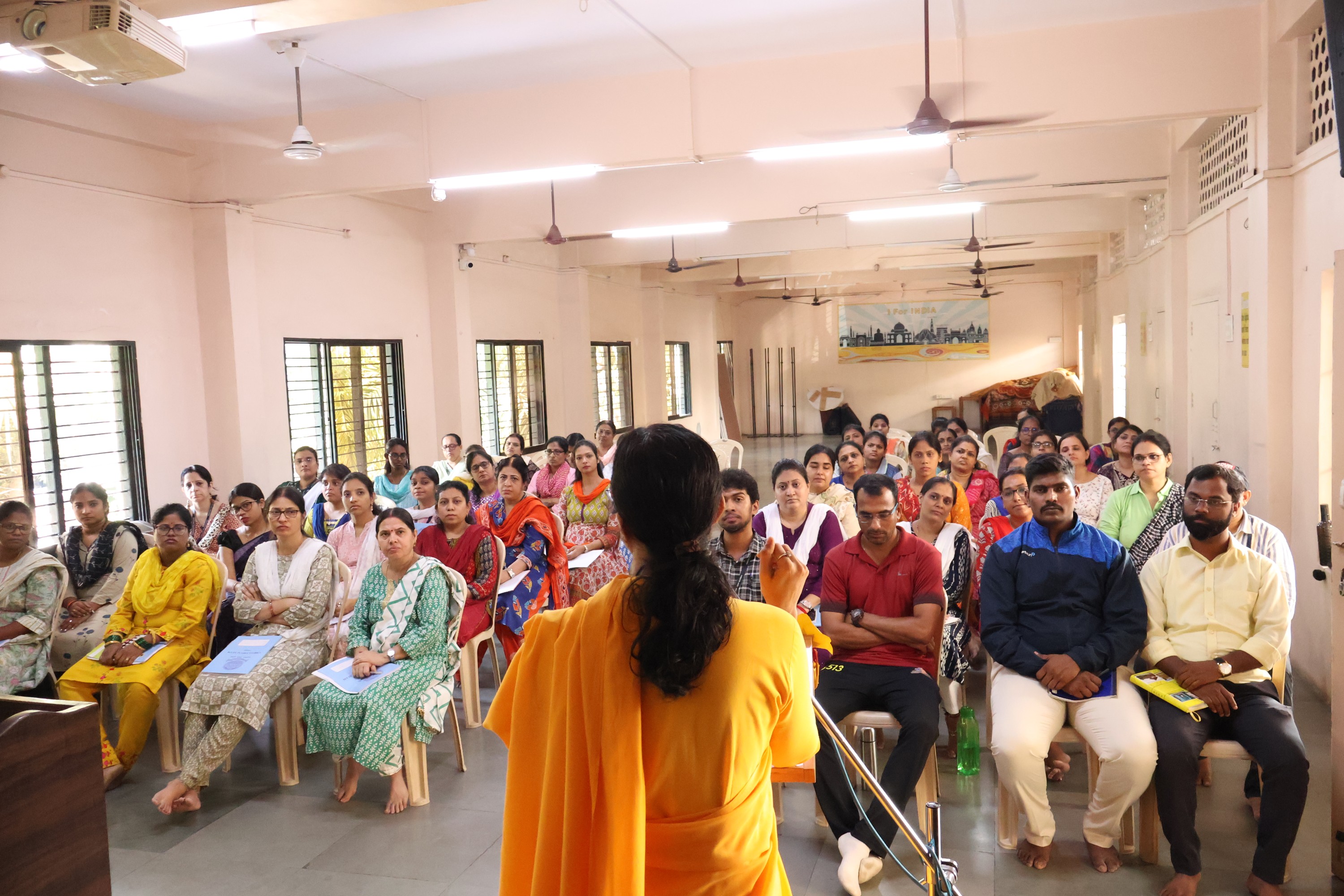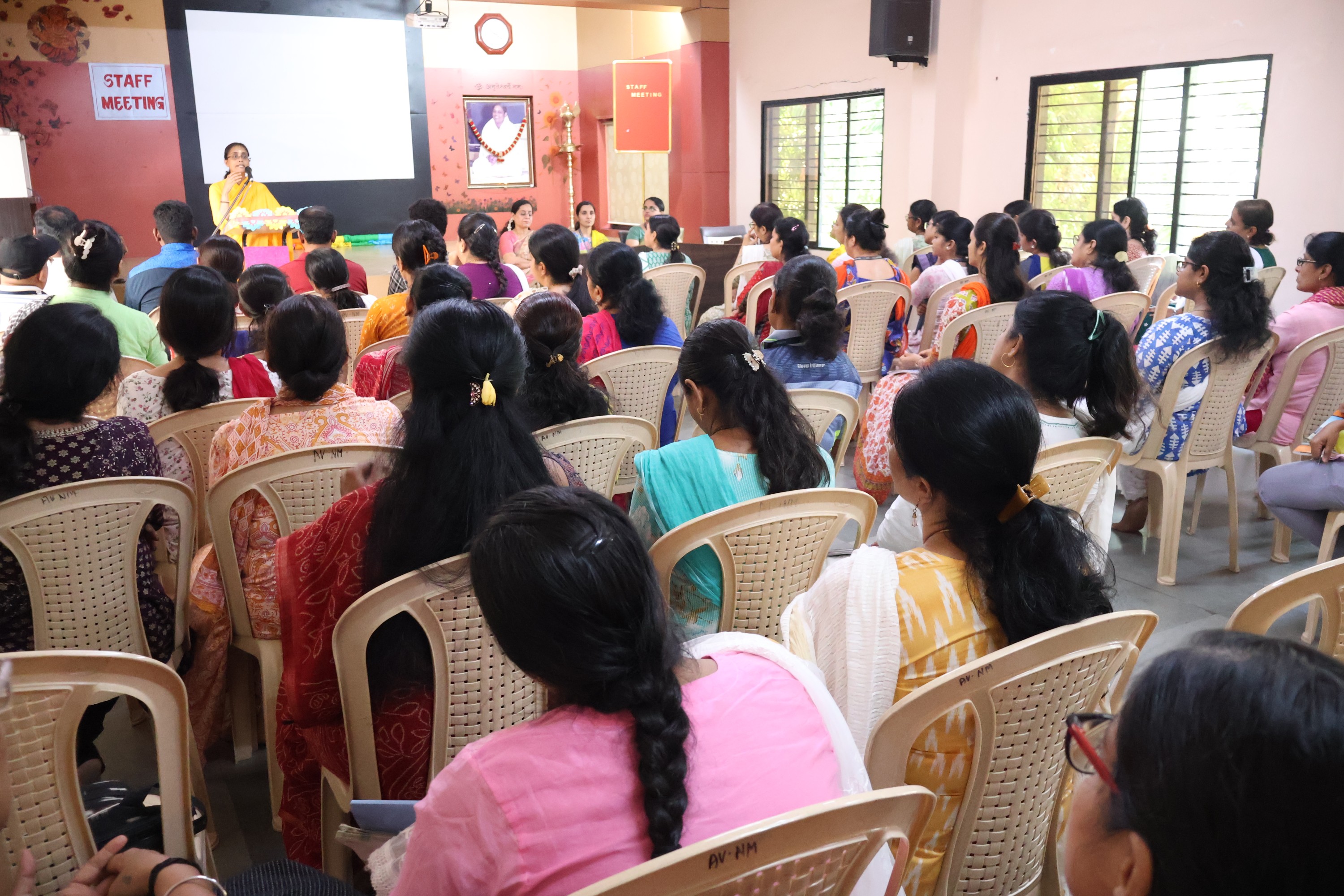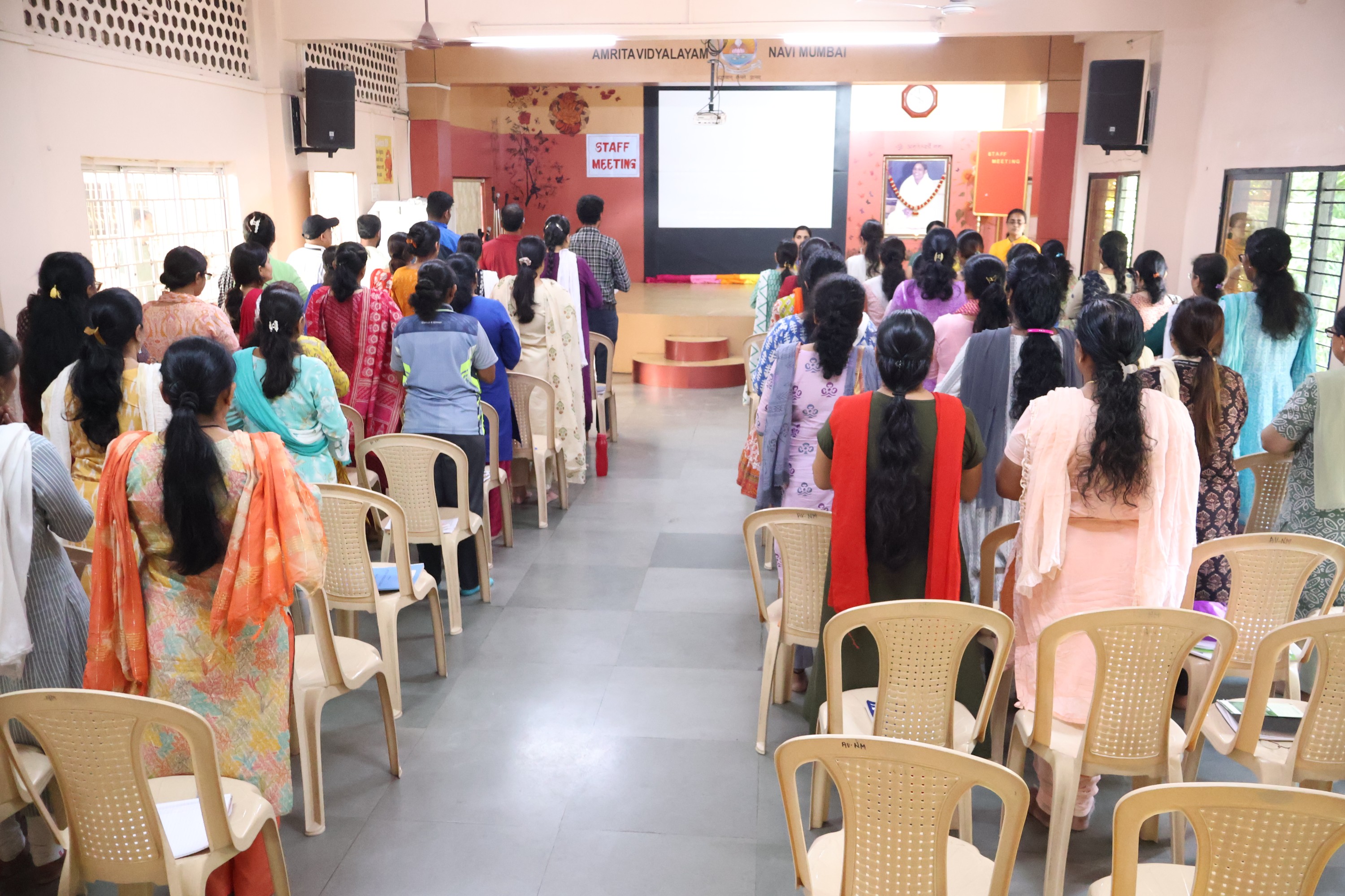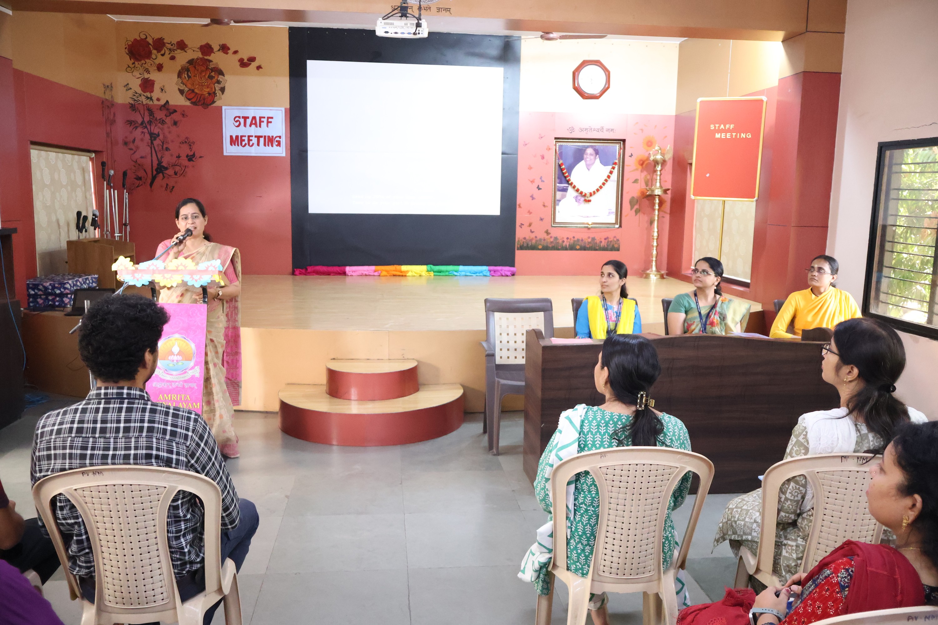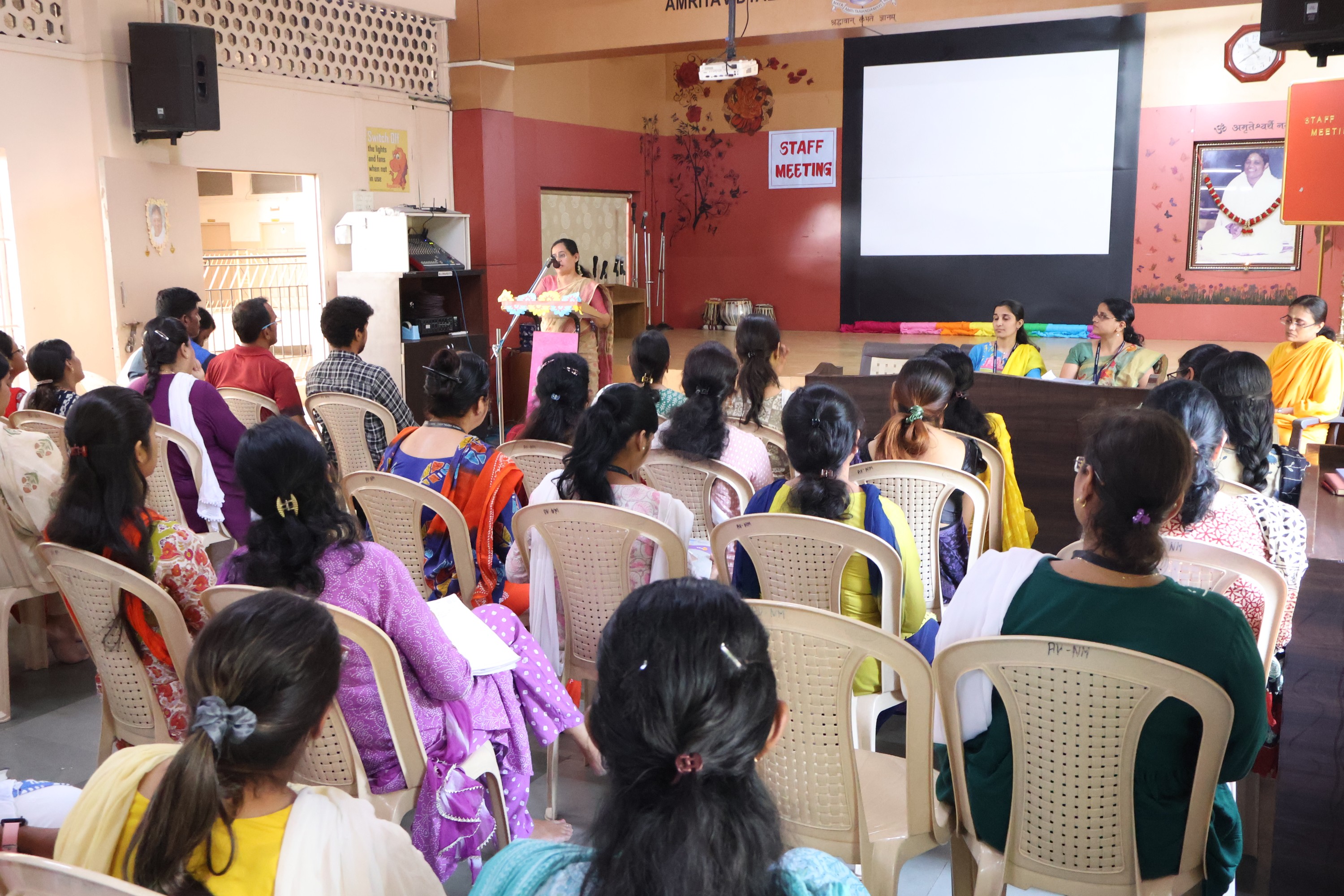 First day of the school for teachers after a month’s vacation is the most important day. This day teacher’s sets the tone for their classroom teaching for smooth running of the upcoming academic year. This day was full of learning with school Administrator Sharanamrita Chitanayaji inducting the teachers about the vision, mission and culture of school as expected by AMMA. She emphasised on the role of the teacher in modern education and reinforced on the discipline to be followed in school and utilize free time for reading some good book or chanting Japa.