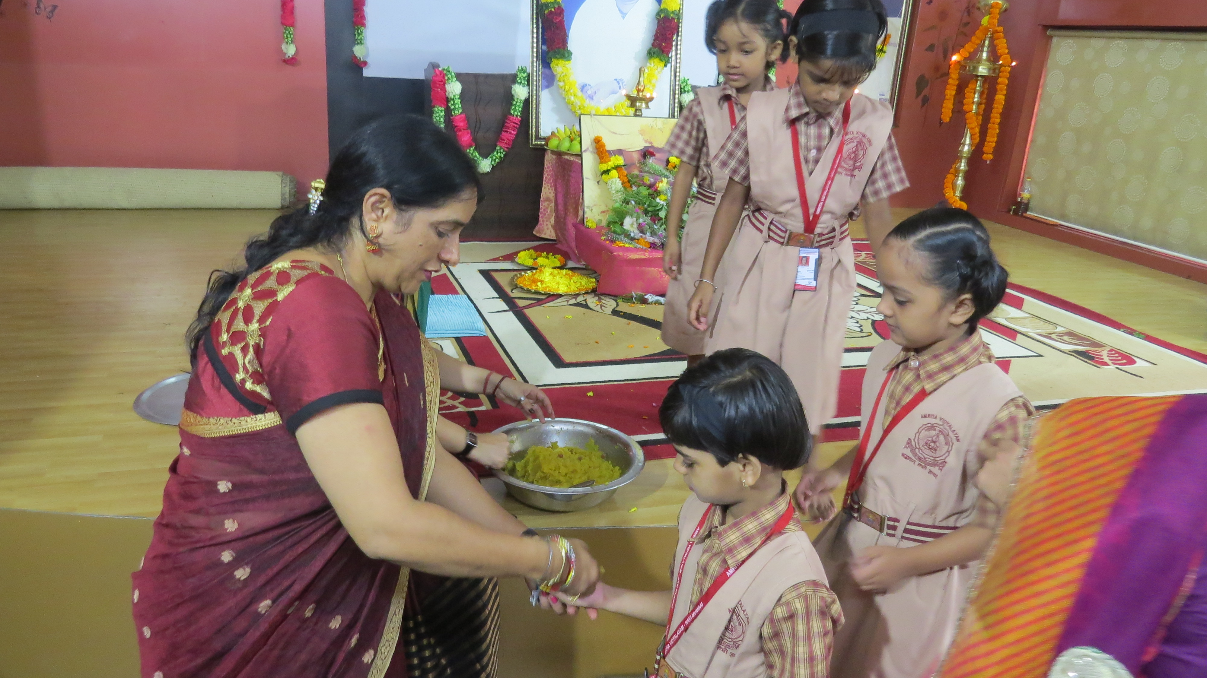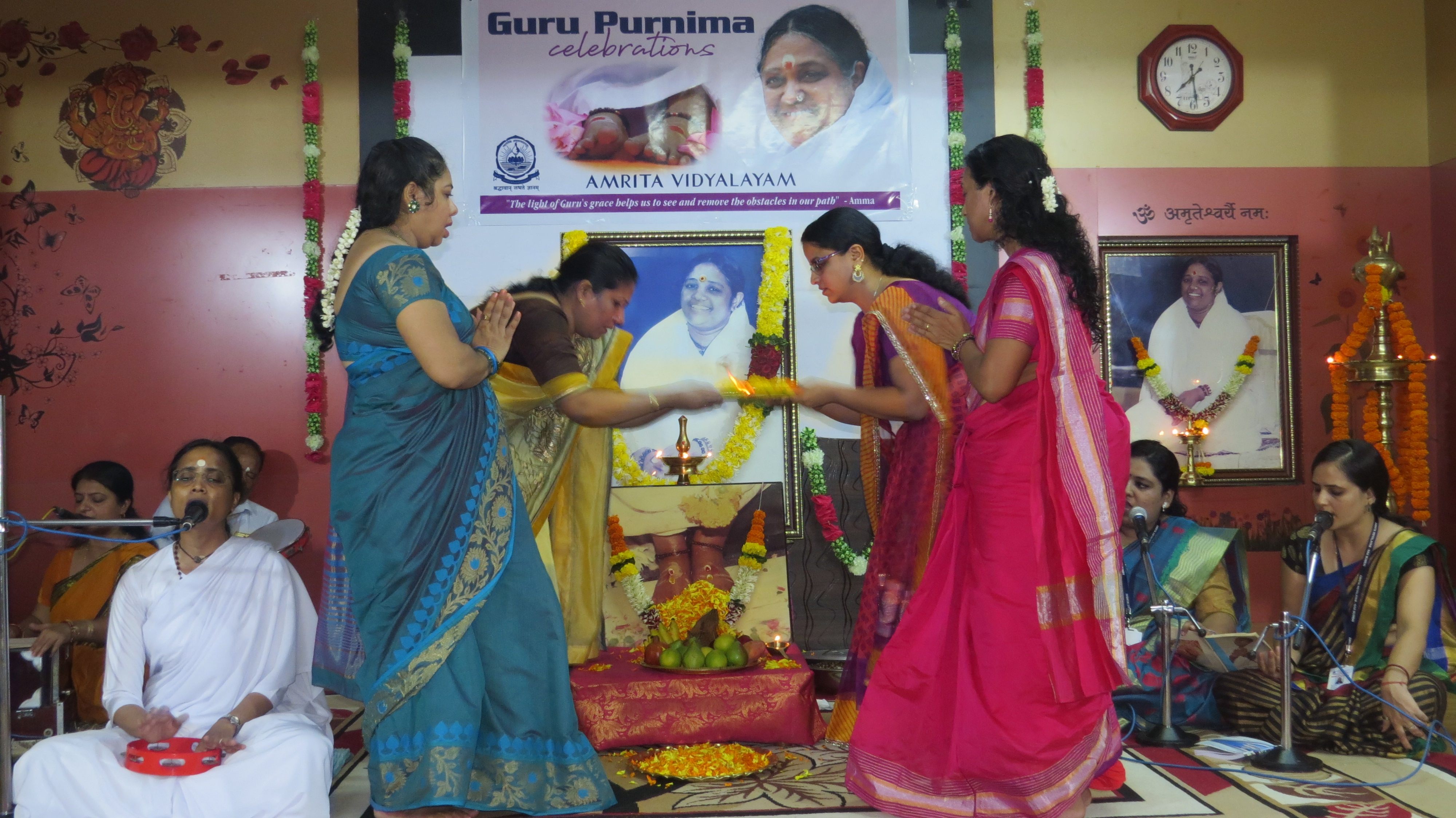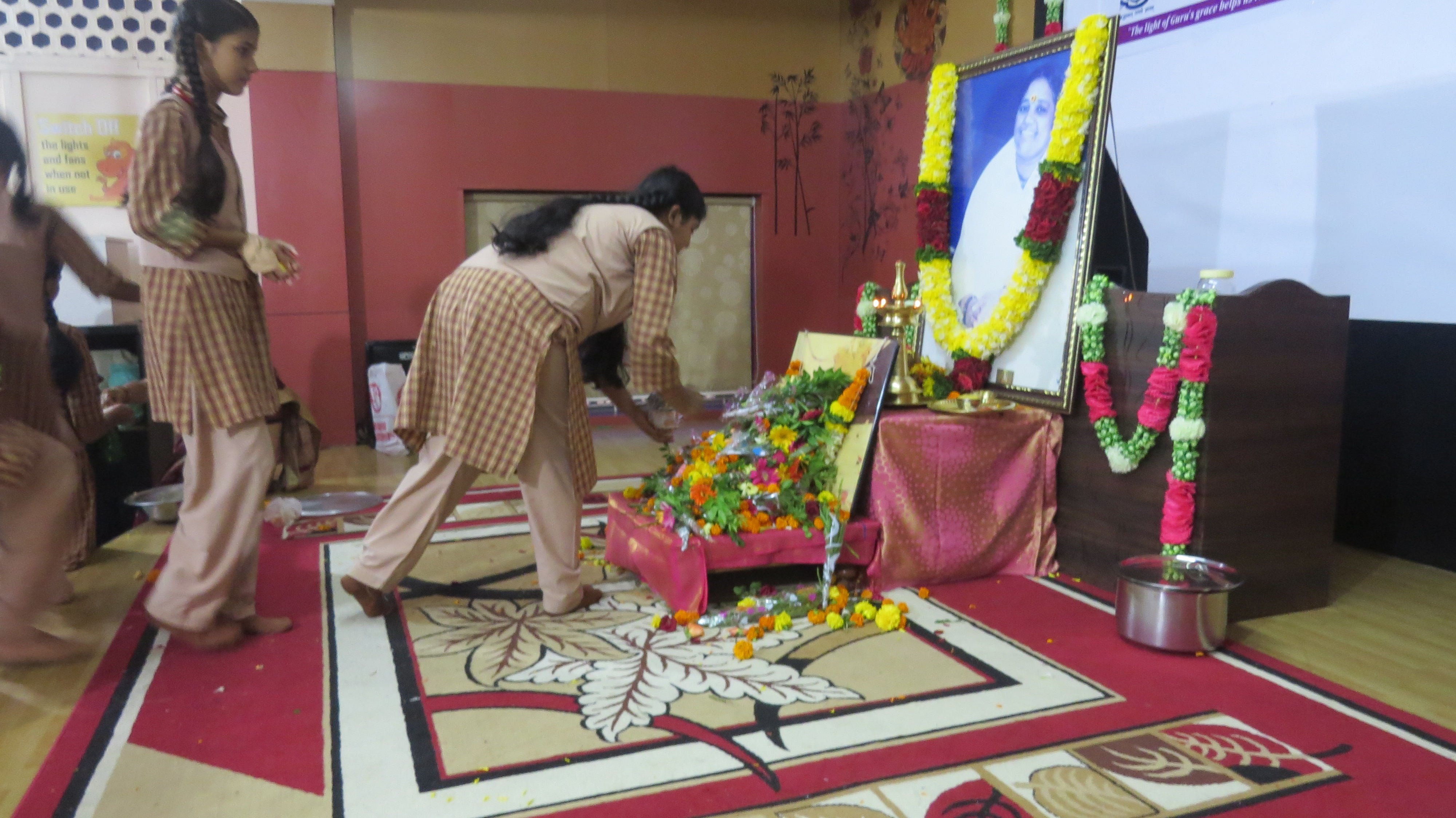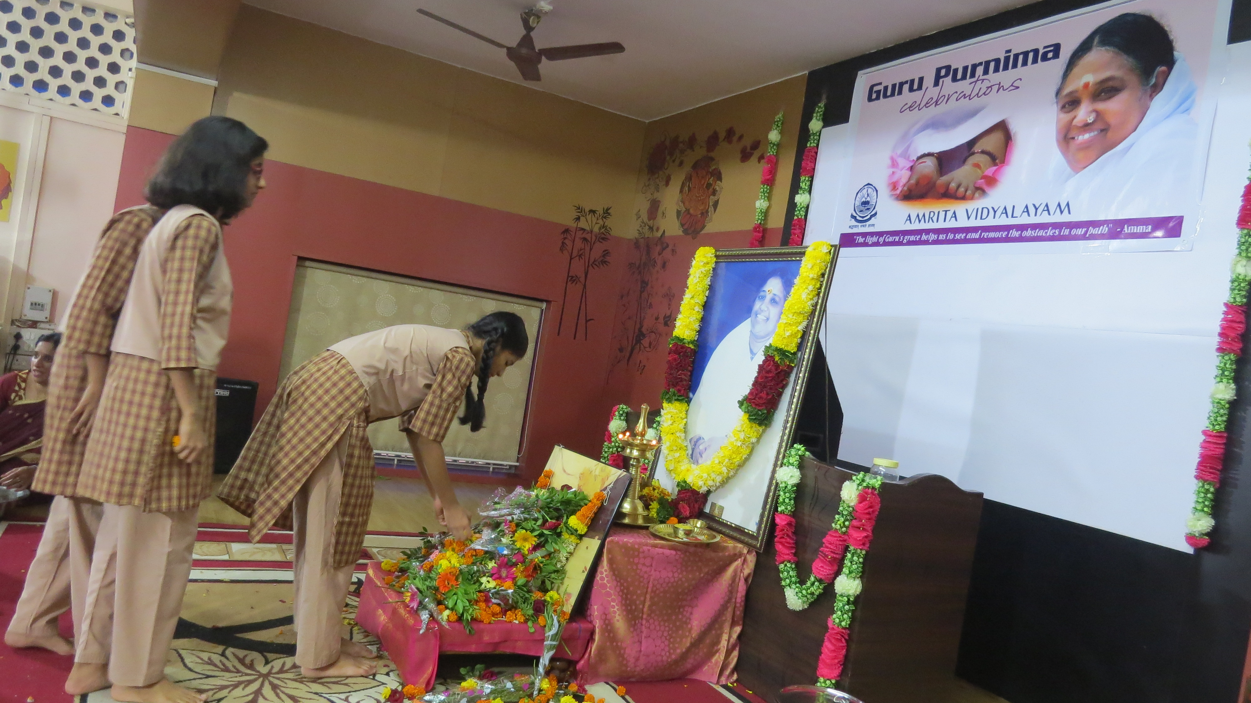 Brni. Rekha guided the teachers to meditate after which the celebrations concluded with Aarthi and the chanting of Shanti Mantra. Teachers and students offered Pushpanjali at Amma’s feet and were given prasad. The prayer students chanted Guru Stotram and a special dedication to Guru by the rendition of a melodious song by Anandamayi House students certainly filled the atmosphere with divinity.