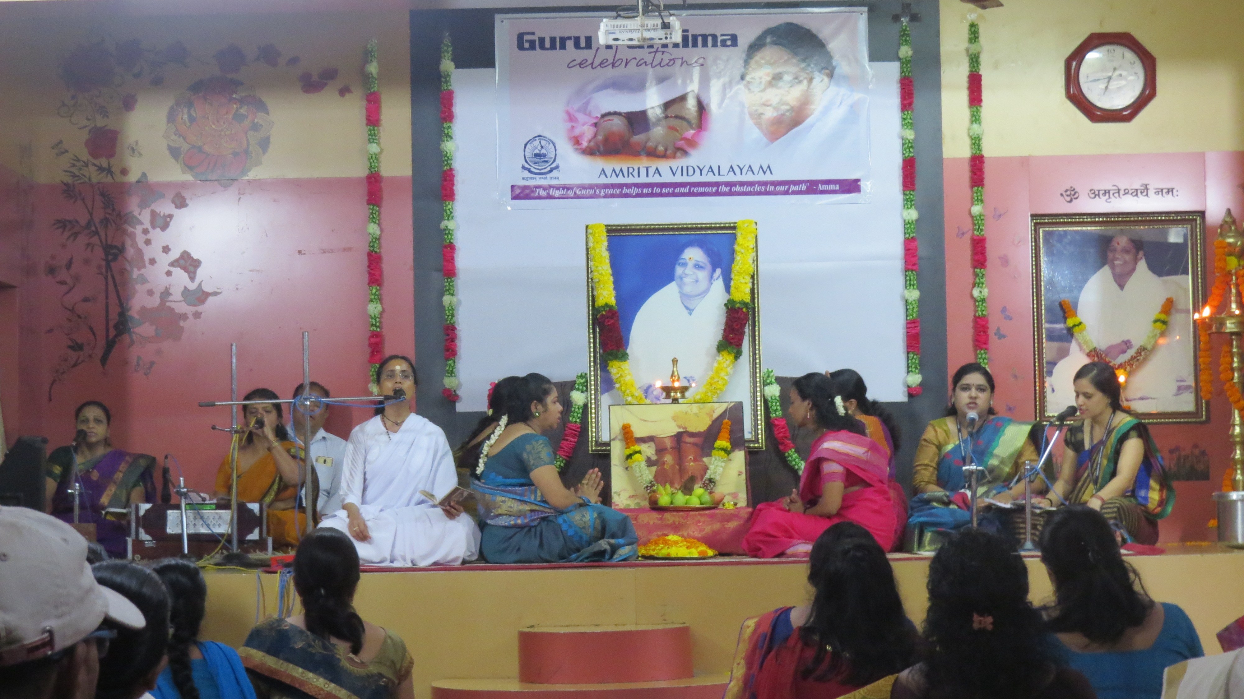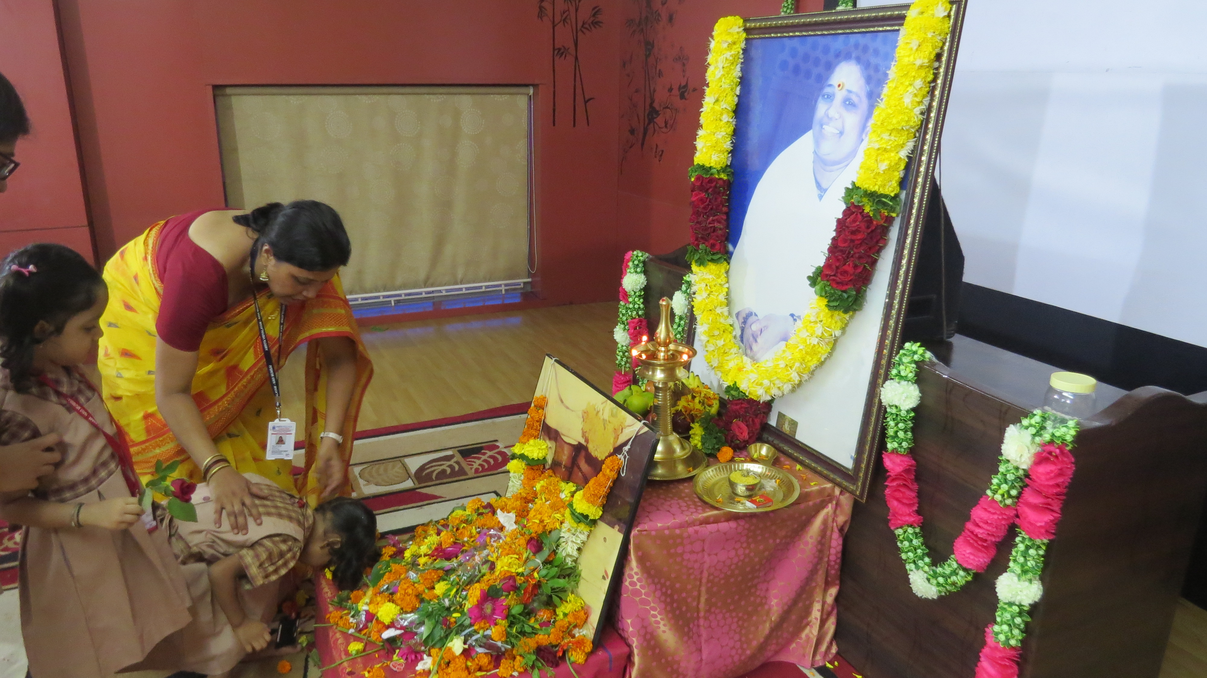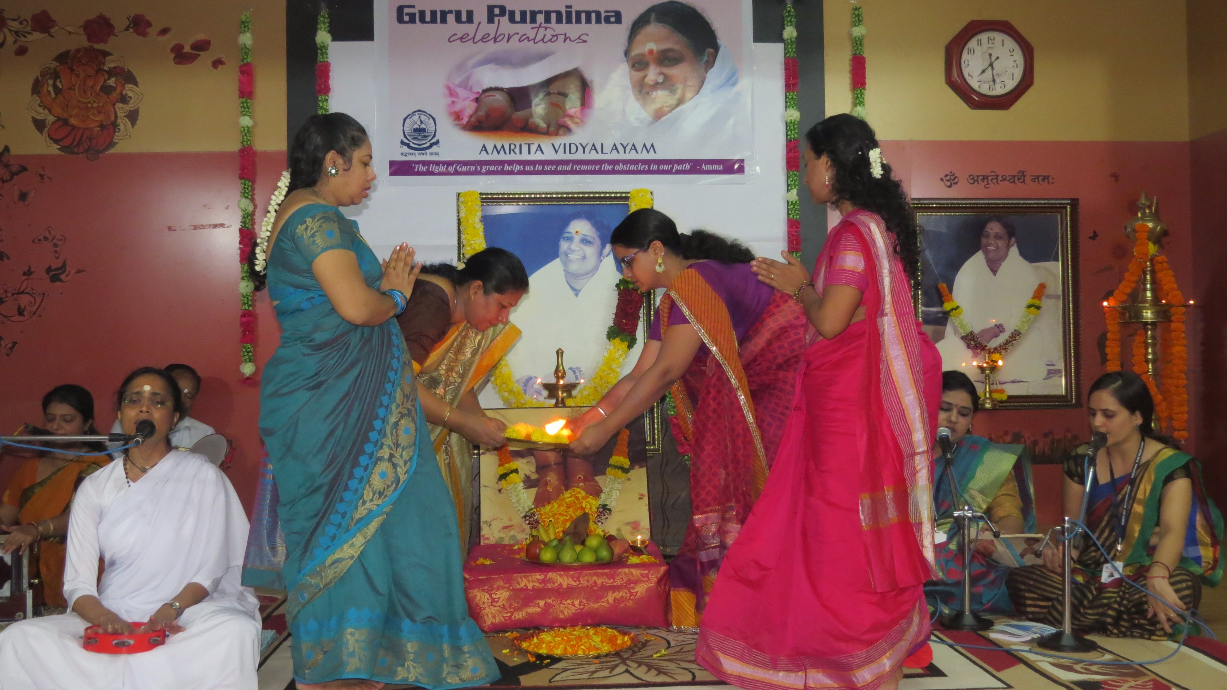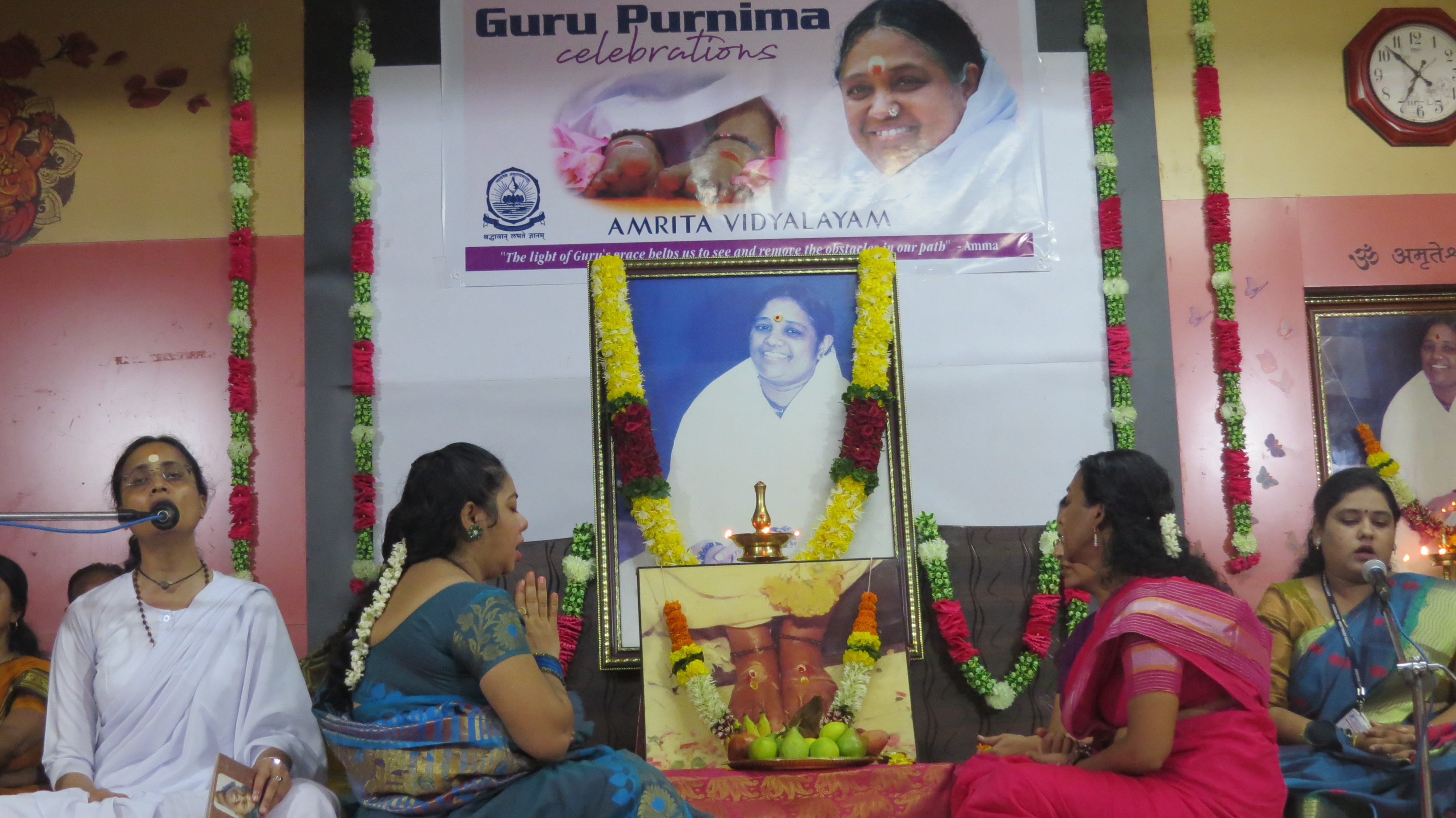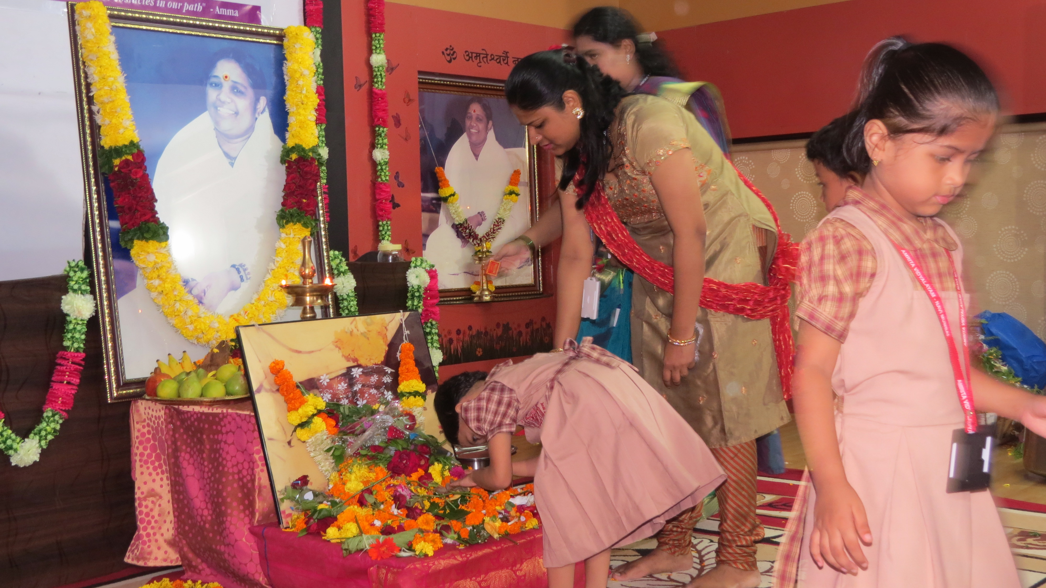 Brni. Rekha guided the teachers to meditate after which the celebrations concluded with Aarthi and the chanting of Shanti Mantra. Teachers and students offered Pushpanjali at Amma’s feet and were given prasad. The prayer students chanted Guru Stotram and a special dedication to Guru by the rendition of a melodious song by Anandamayi House students certainly filled the atmosphere with divinity.