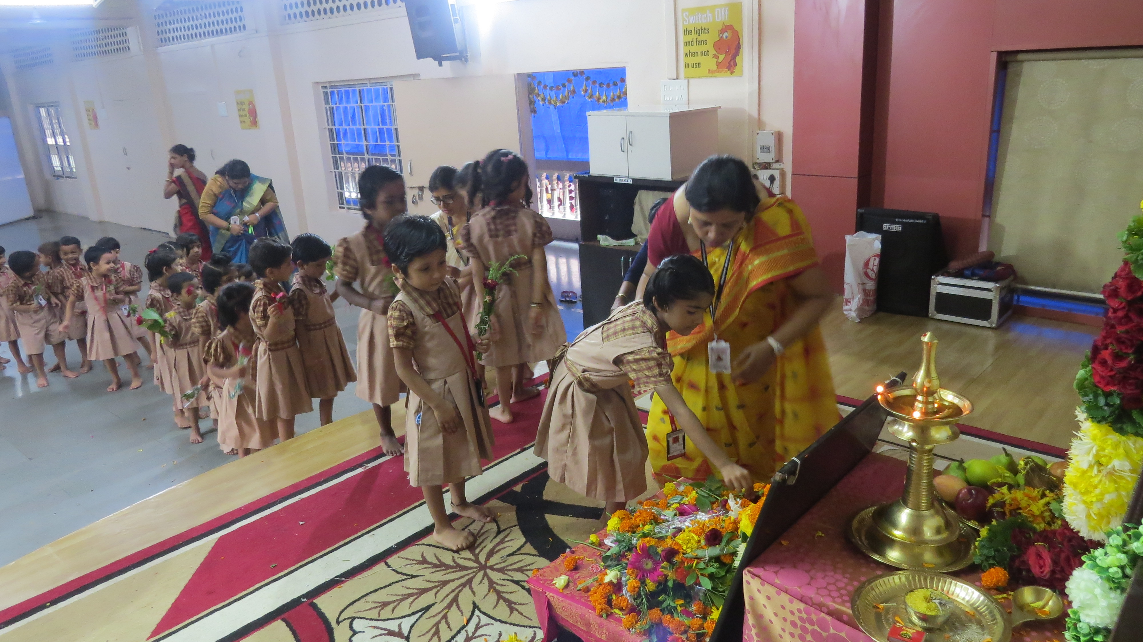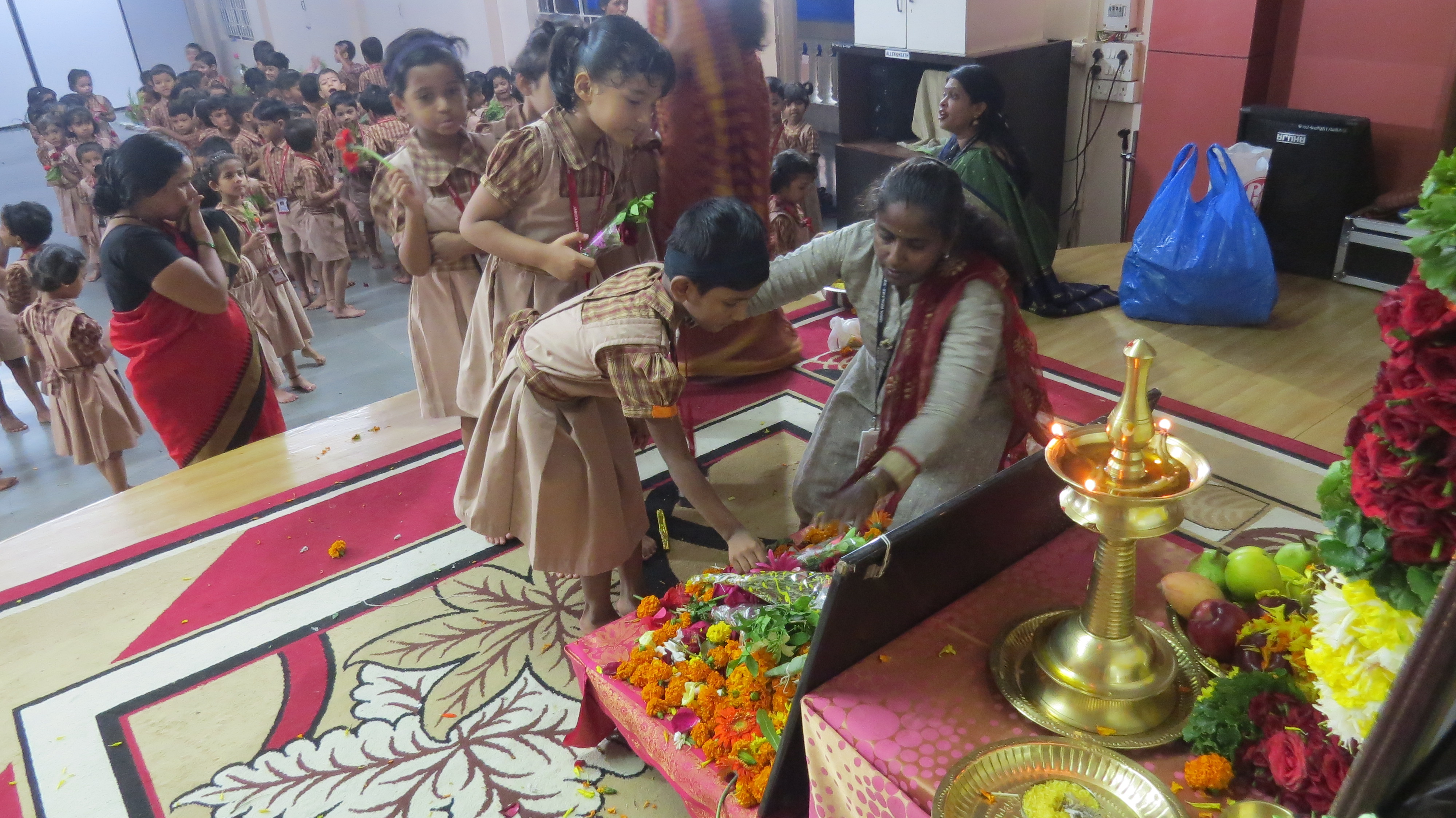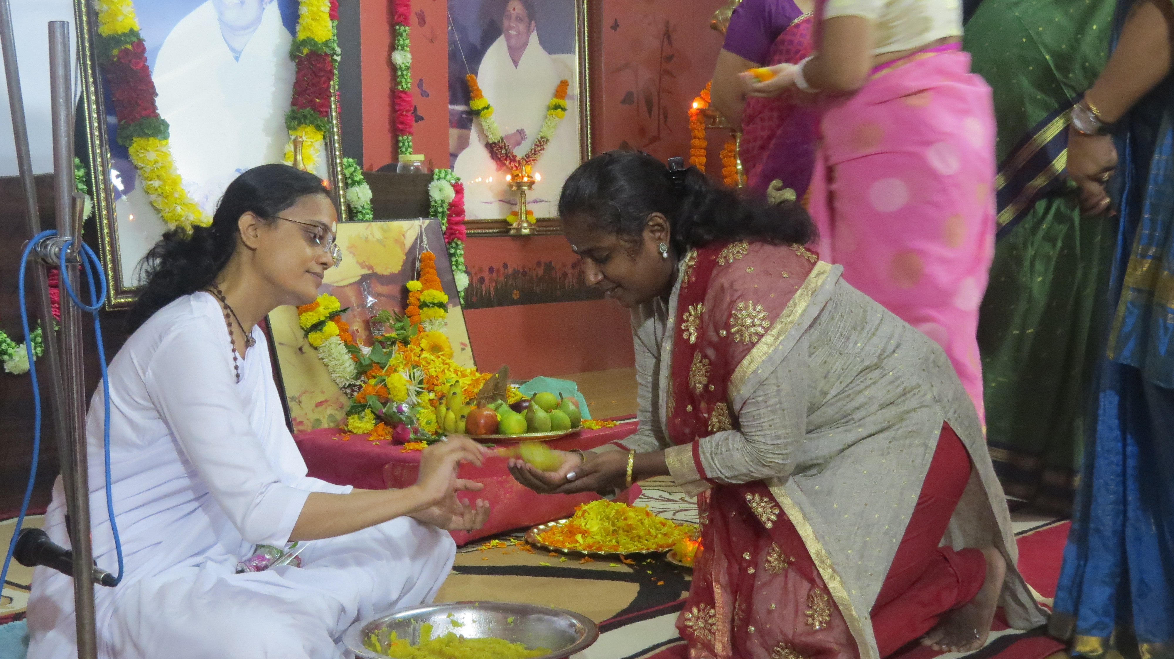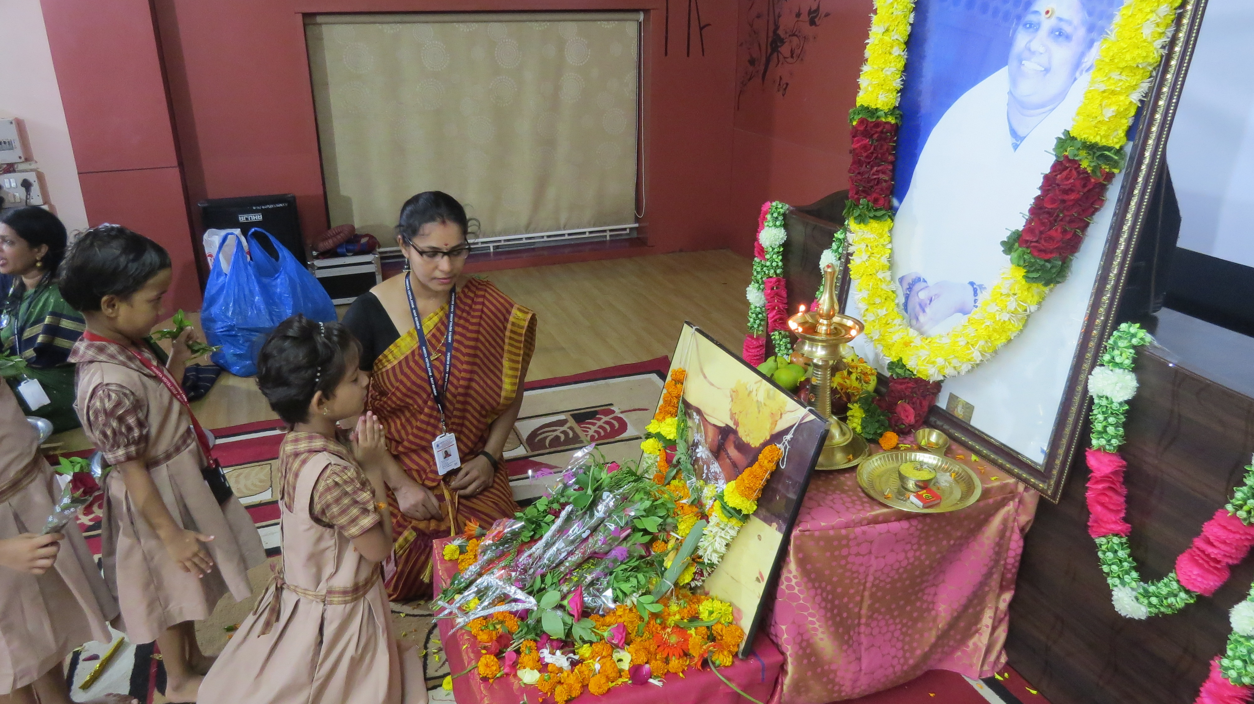 Brni. Rekha guided the teachers to meditate after which the celebrations concluded with Aarthi and the chanting of Shanti Mantra. Teachers and students offered Pushpanjali at Amma’s feet and were given prasad. The prayer students chanted Guru Stotram and a special dedication to Guru by the rendition of a melodious song by Anandamayi House students certainly filled the atmosphere with divinity.
