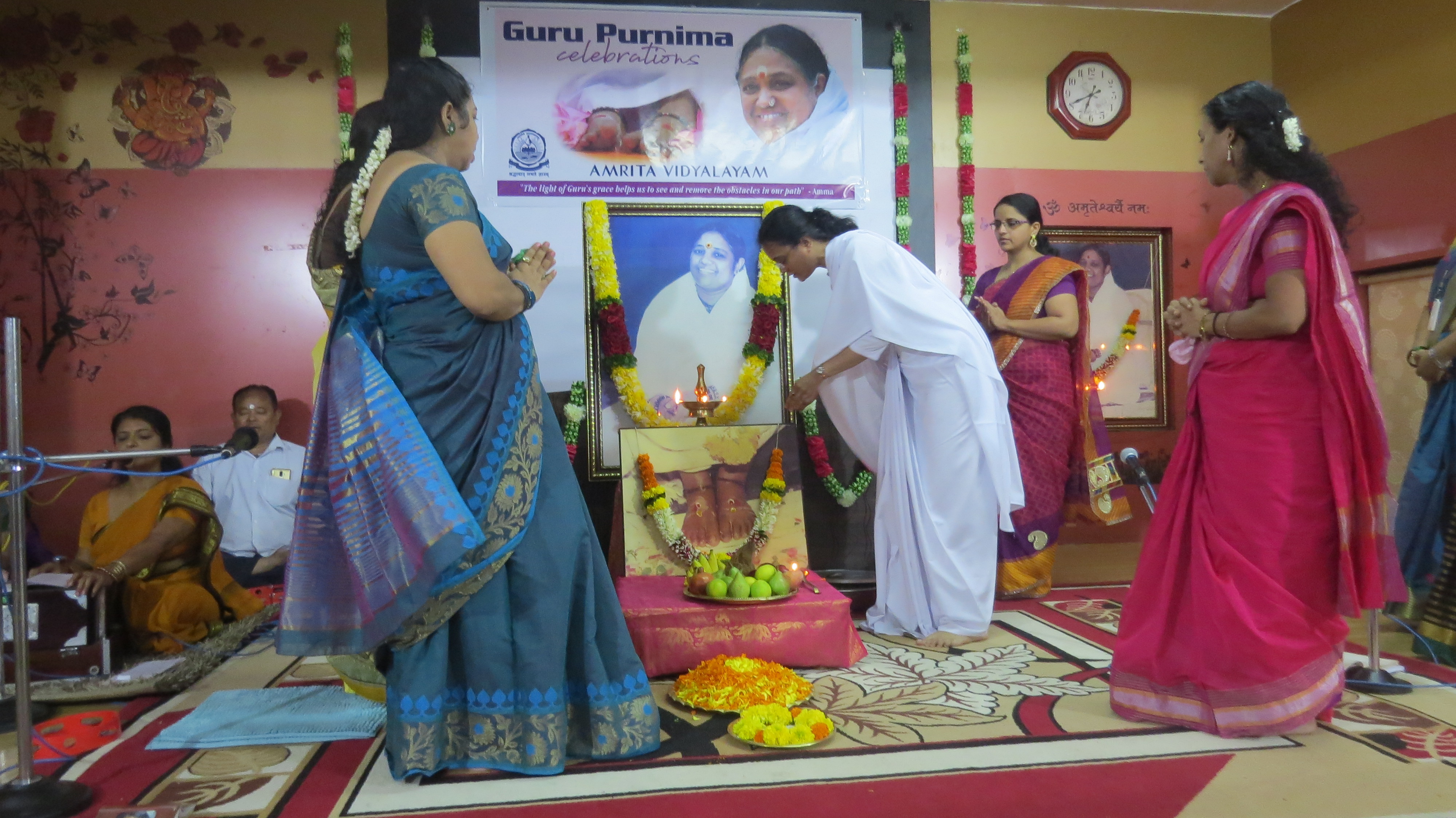 “To be able to receive Guru’s grace is the greatest blessing ” – Brni. Rekha addressed the teachers with these profound words on the occasion of Guru Purnima. Teachers assembled early morning to participate in the Guru Purnima celebrations which was conducted in the auditorium. The programme began with the lighting the auspicious lamp amidst chanting of “Om Amriteshwaryay Namah”. All of them chanted Guru Stotram with great reverence to Amma – Mata Amritanandamayi Devi. Principal Brni. Rekha led everyone to the chanting of Ashtottram (108 names of Amma) to which everyone chanted “Aum Amriteshwari Namah” and offered flowers at the holy lotus feet of Amma.
