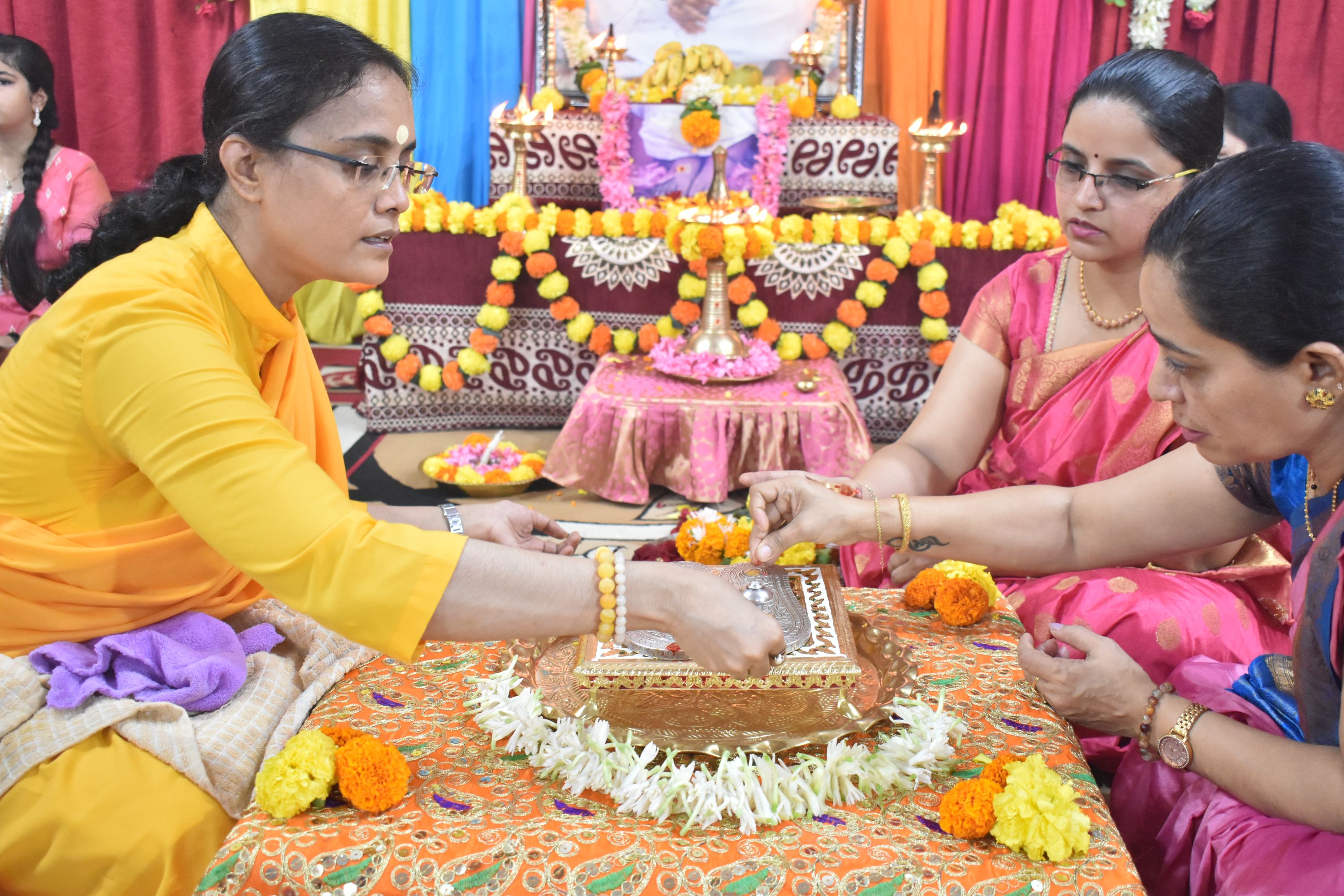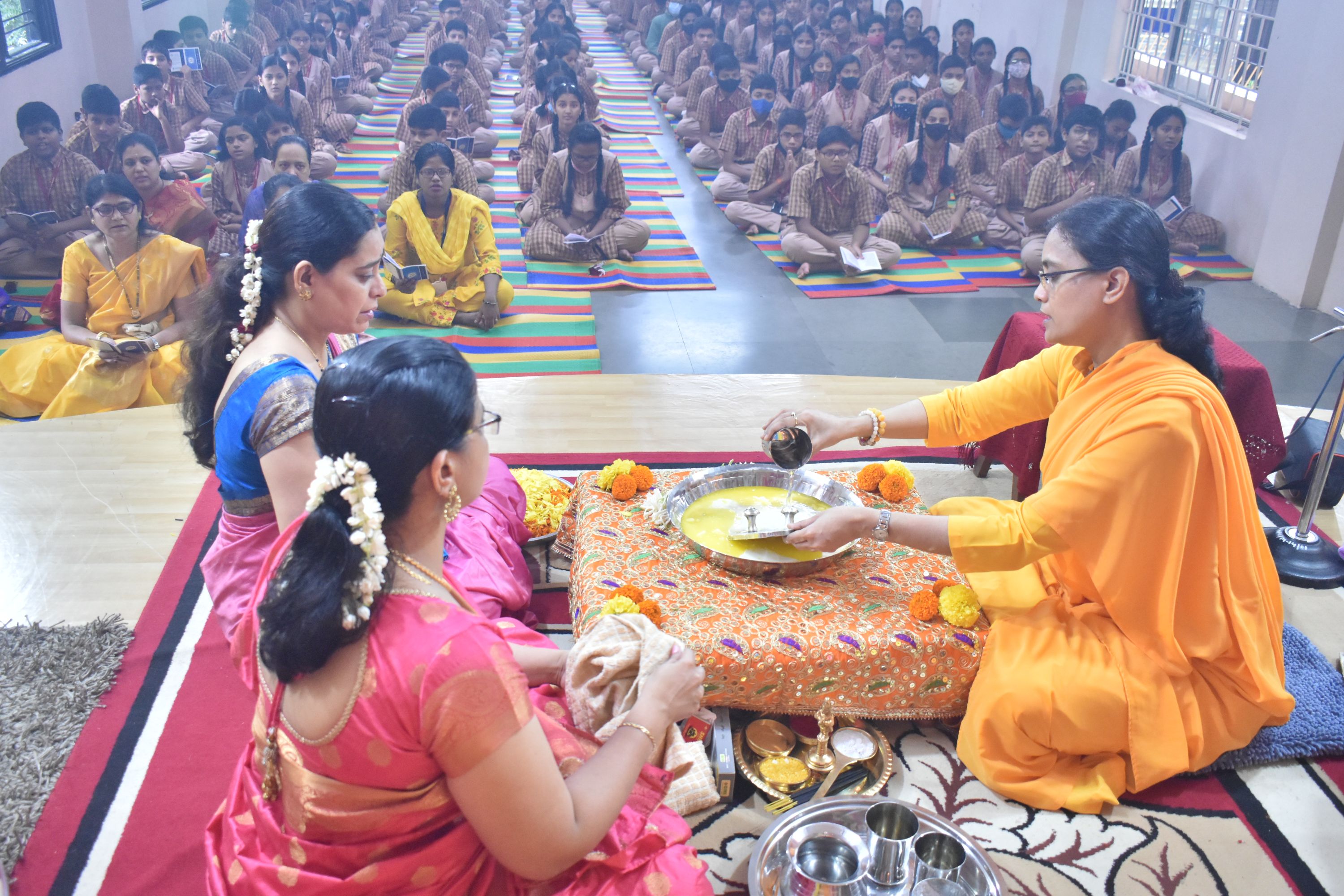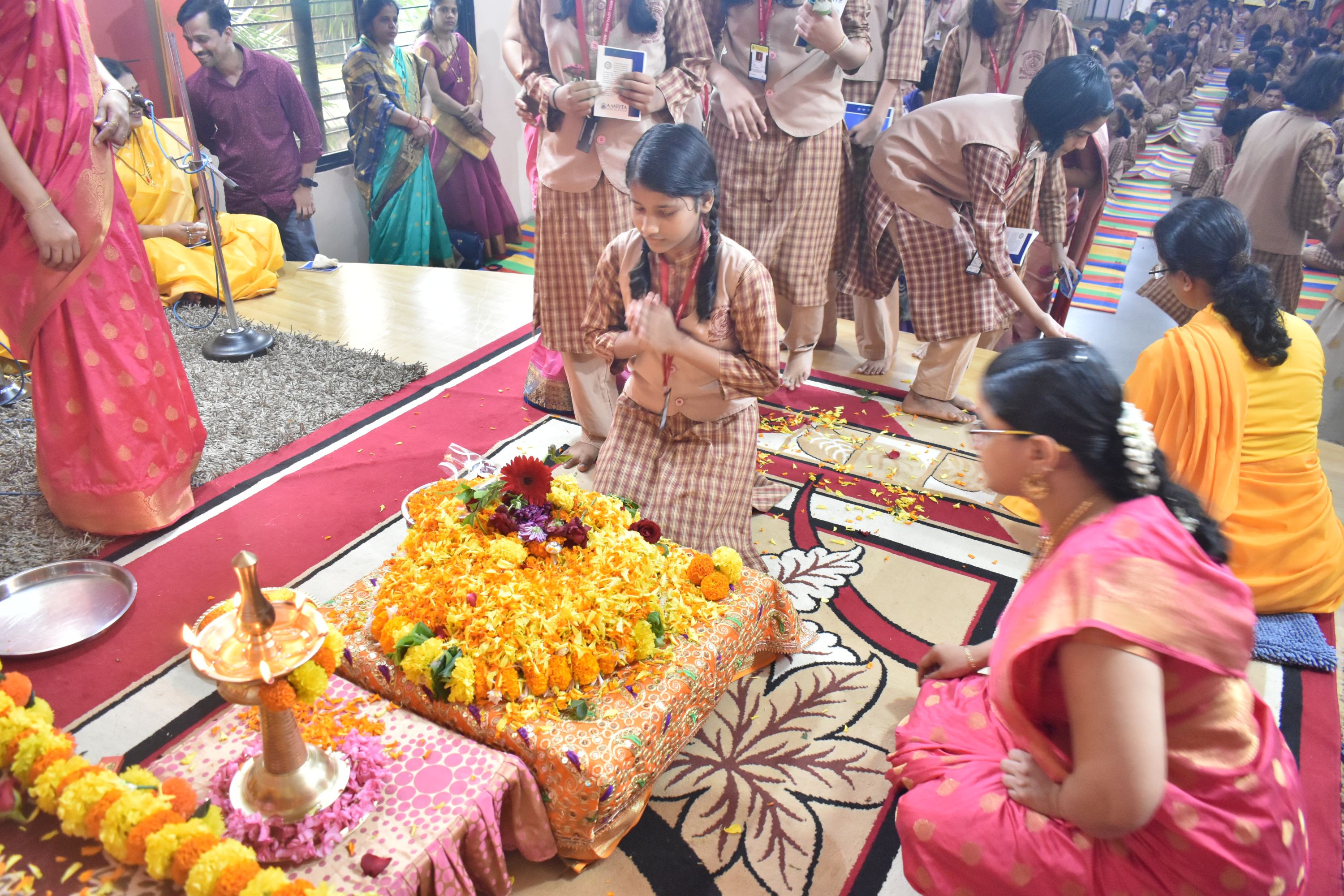 Mantras are the purest form of universal vibration or Shakti. It helps to focus and attain perfect purity of thoughts. The program continued with Chanting of Guru stotram followed by Guru Paduka during which Guru Paduka Pooja was performed by Swamini Sharanyamrita Chaitanya and the Vice Principal of the school with the chanting of Amma’s Ashtotram.