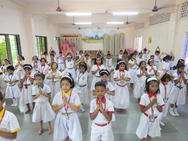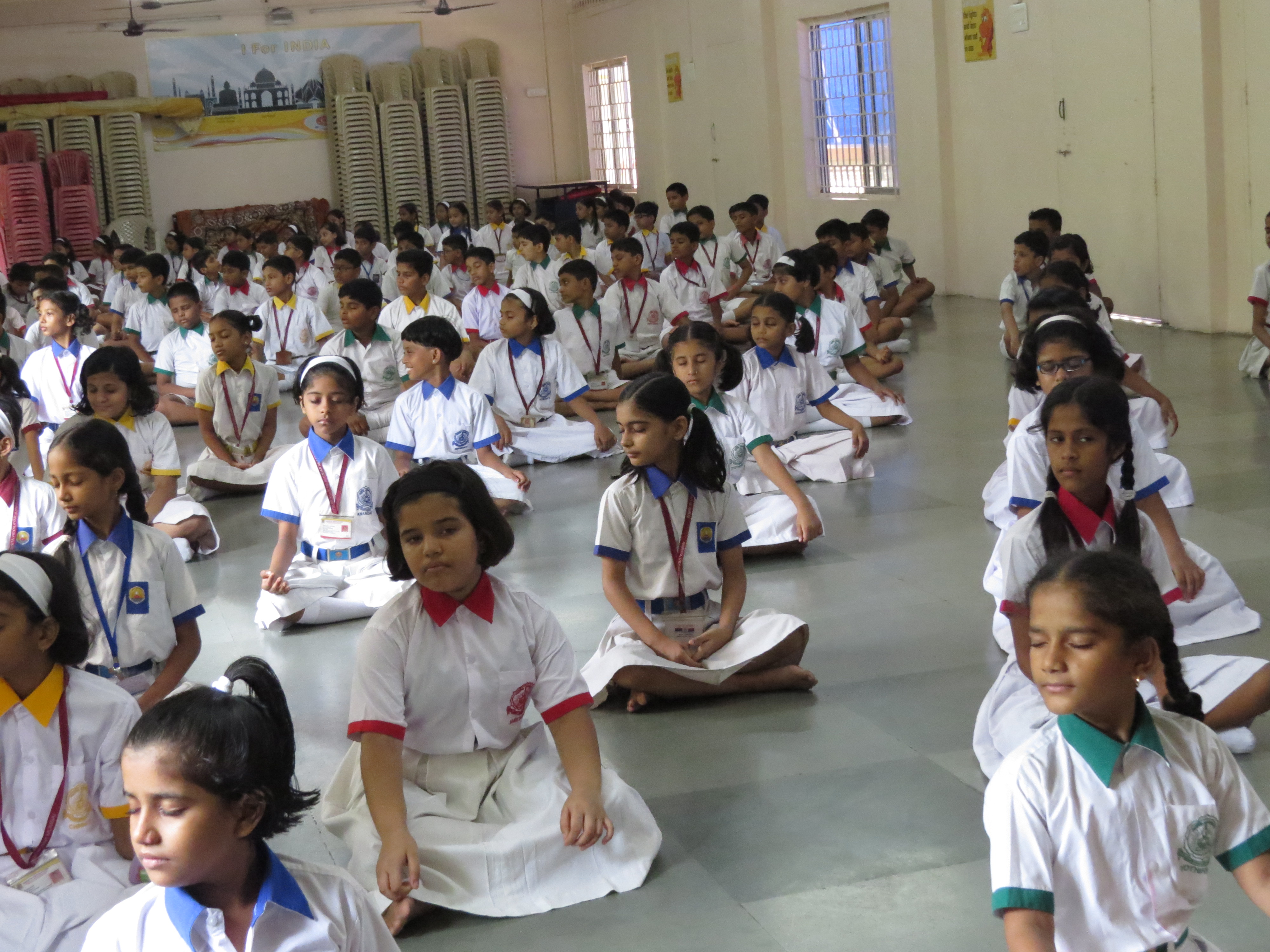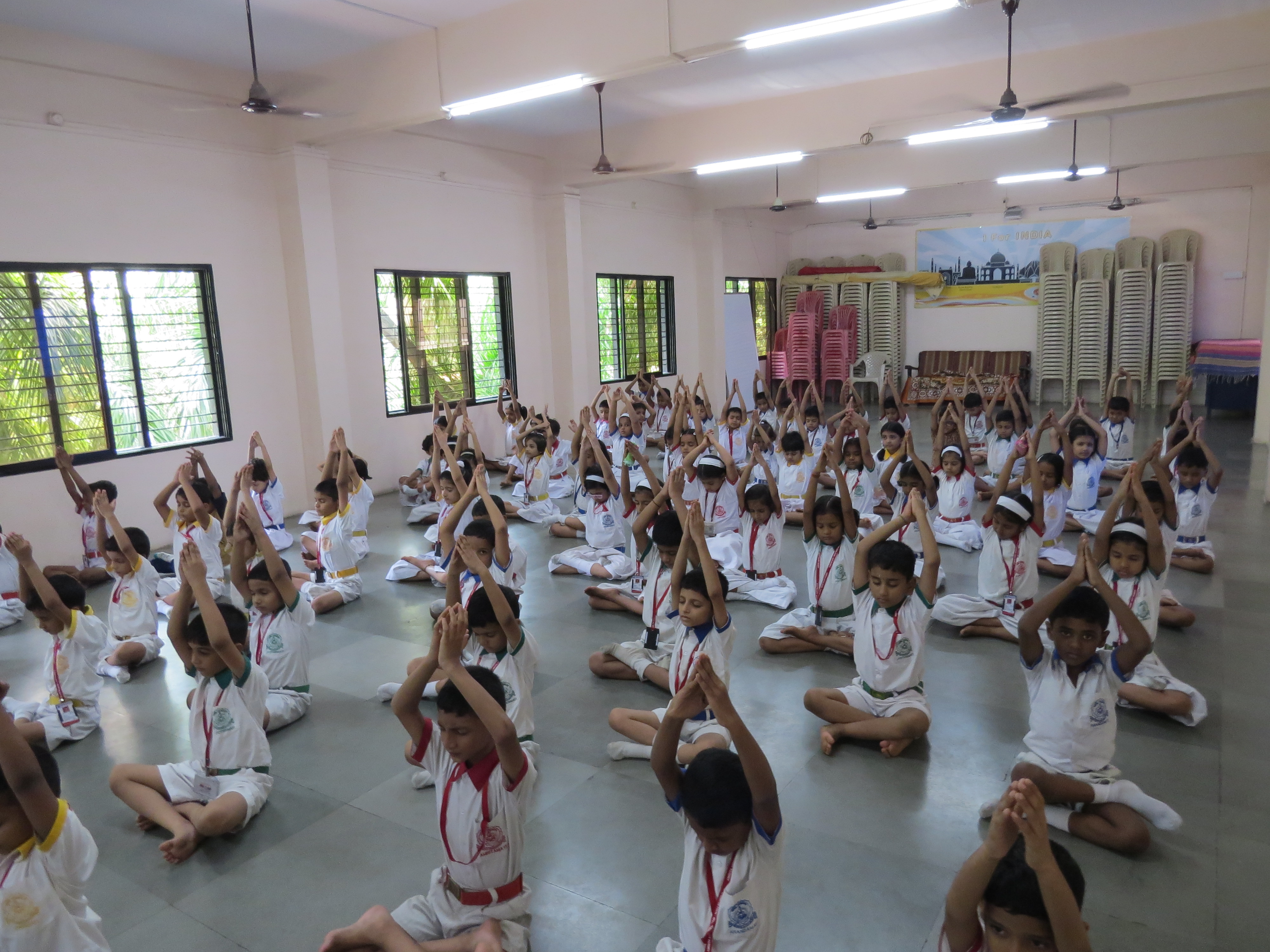 Around 1300 students from Amrita Vidyalayam, Juinagar Navi Mumbai participated in the International Day of Yoga on June 21st, 2019 at both the Ashram and school premises. The programme began with the traditional lighting of the lamp by Principal Brni. Rekha and the guests, followed by a prayer and the beautifully composed “Yog Geet”. The school was privileged to have Shri Sahebdin Ramprasad Das an experienced Yoga teacher from Yoga Vidya Niketan, Vashi, as the Chief Guest, who was accompanied on the stage by Br. Avyayamrita Chaitanya and Suja teacher- the school’s Yoga teacher. The guests were welcomed with a flower sapling, in consonance with today’s environmental call.