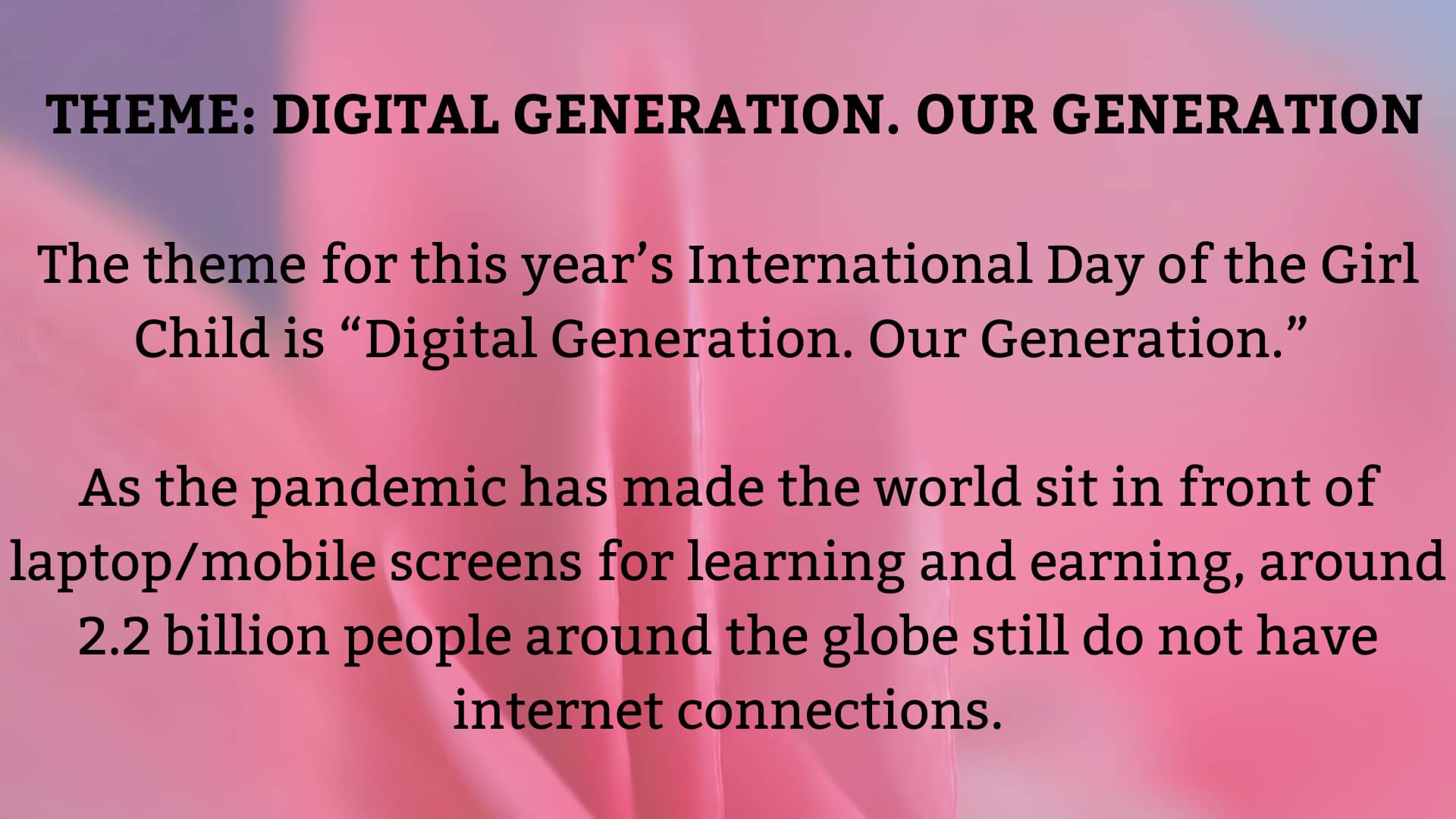 The theme of International Day of Girl Child 2021 was “DIGITAL GENERATION. OUR GENERATION.”In the age of digital revolution where people are using technology in various ways to learn new skills and earn revenue, women and girls cannot be left behind.