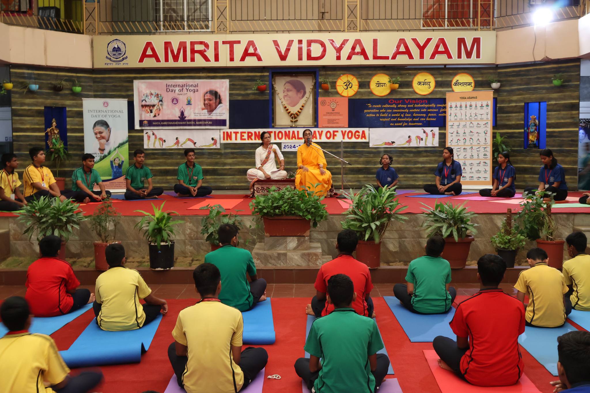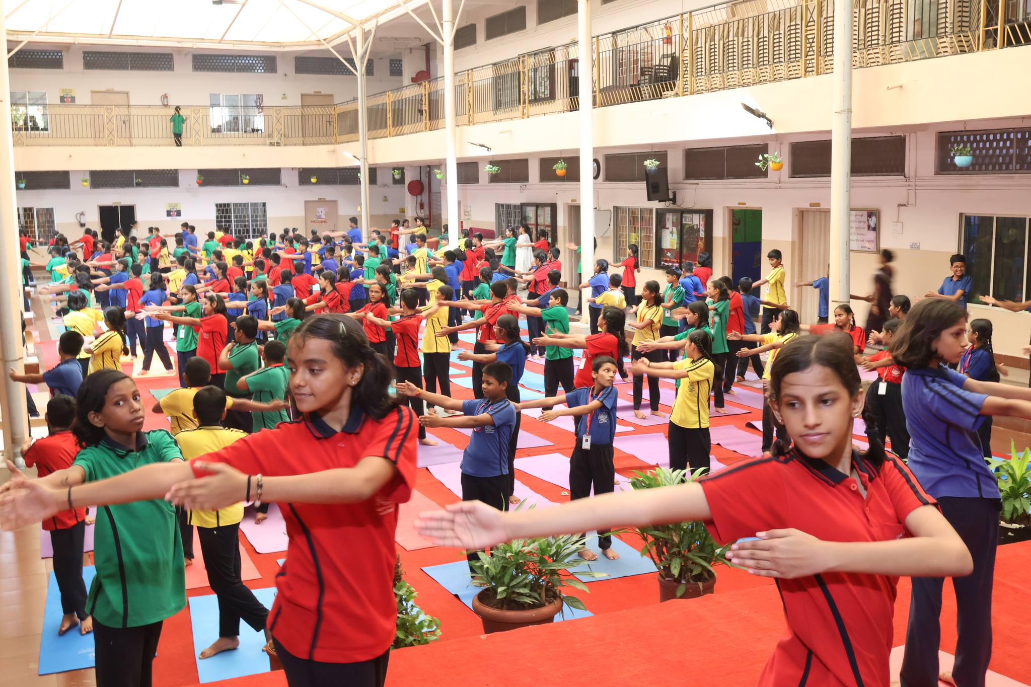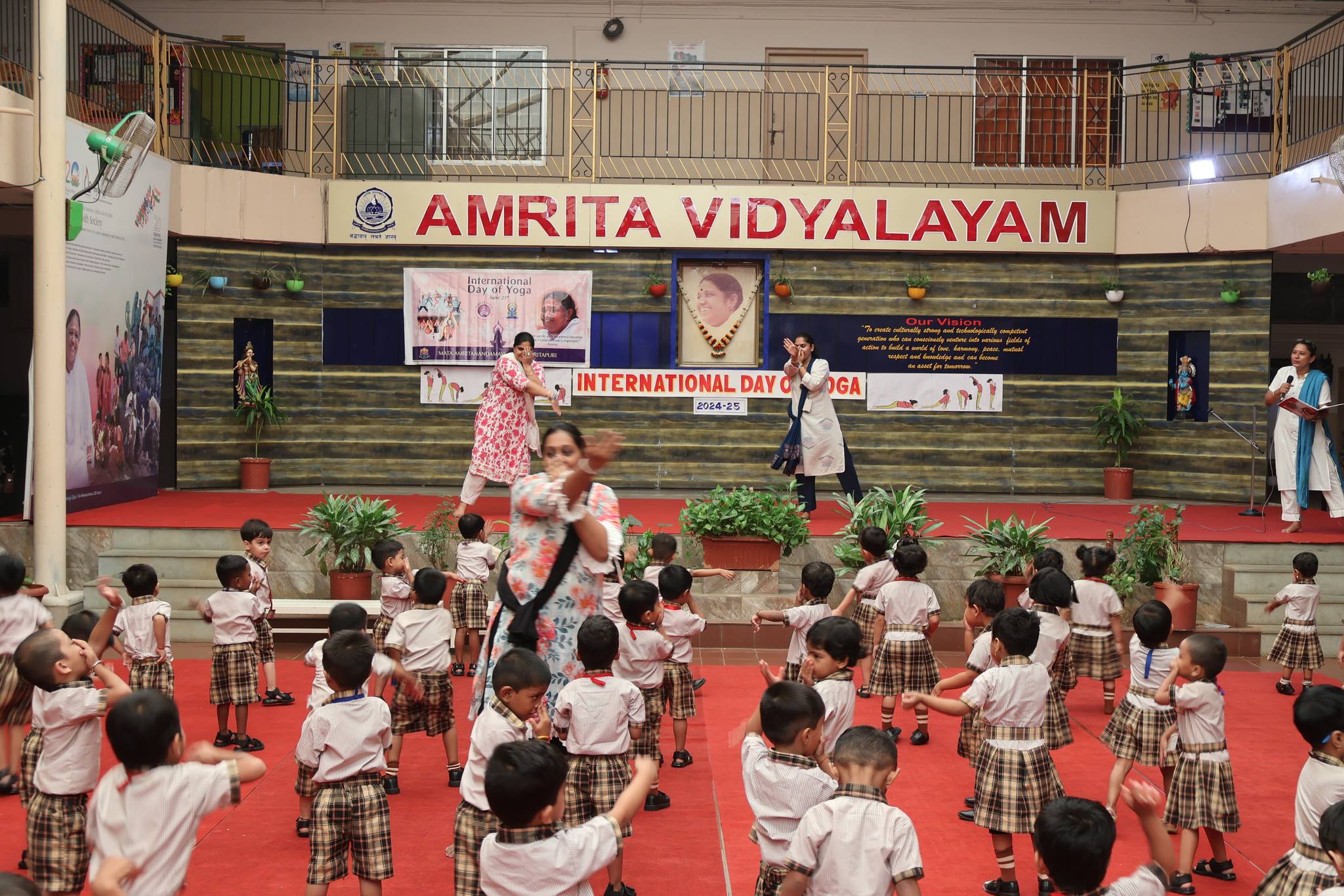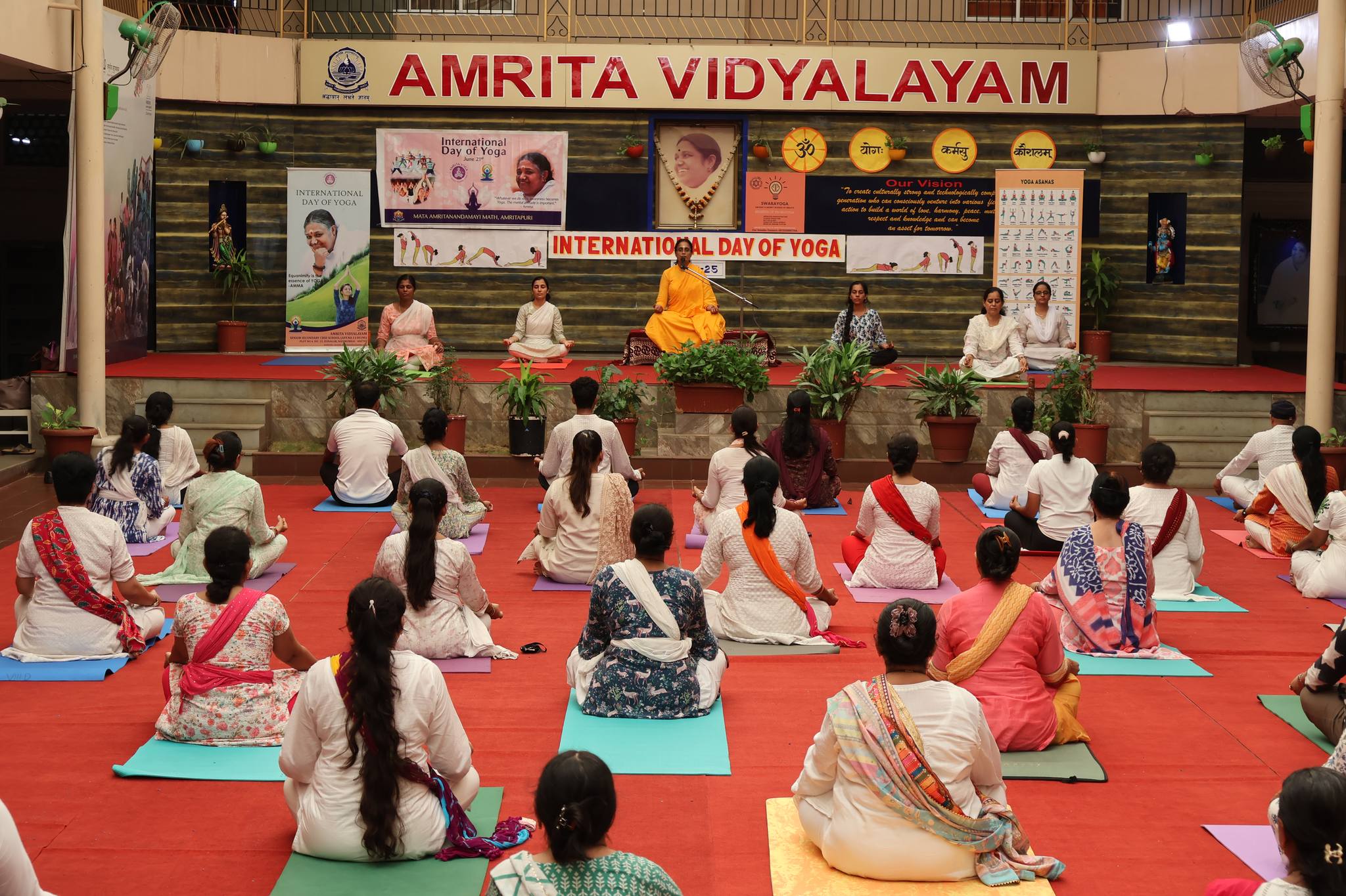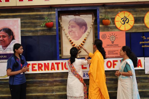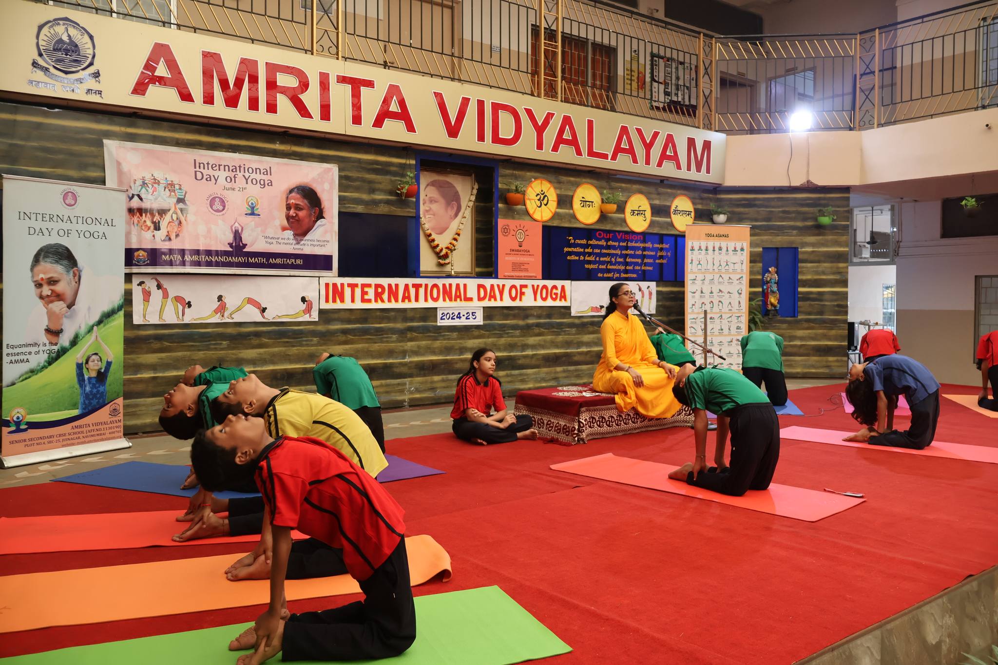 International Day of Yoga is celebrated every year on 21st June since its inception in the year 2015. Yoga itself is a very old practice that is followed in India since time immemorial. Yoga is an invaluable gift of India’s ancient tradition. Yoga’s aim is not only to heal body but to purify all three: Mind, body and soul. As a whole Amrita Vidylayam practiced common IDY protocol on 21st June from 7.30 a.m. onwards led by administrator Brni. Sharanyamrita Chaitanyaji. There was also an interesting session on practicing Swara Yoga, by Swara Yoga expert Dr Trupti Tanawade-Digge, Doctor by profession and practicing dentistry in Navi Mumbai for the last 25 years. She is an ardent devotee of Mata Amritanandamayi Devi. She is also the disciple of Swami Charanashritji, one of the few masters preserving and teaching the sacred science of Swara Yoga. Dr Trupti explained the benefits of Swara yoga and how to use 2 sides of the brain to its optimum capacity through Swara Yoga. Administrator Brni. Sharanyamrita Chaitanyaji conducted the IDY yoga protocol session and talked about various benefits of yoga for students. The IDY protocol included warm up exercises, various sitting and standing asanas and breathing exercises during the session for the students in different batches. 1700 students of class 1 to 12 participated in the yoga session in different slots throughout the day. Teachers also participated enthusiastically in the session organized for them at the end of the day. Pre-primary students performed animal yoga and exhibited the flexibility of their body with different Yoga postures. Overall International Yoga Day was celebrated with great enthusiasm and spirit in the school campus.