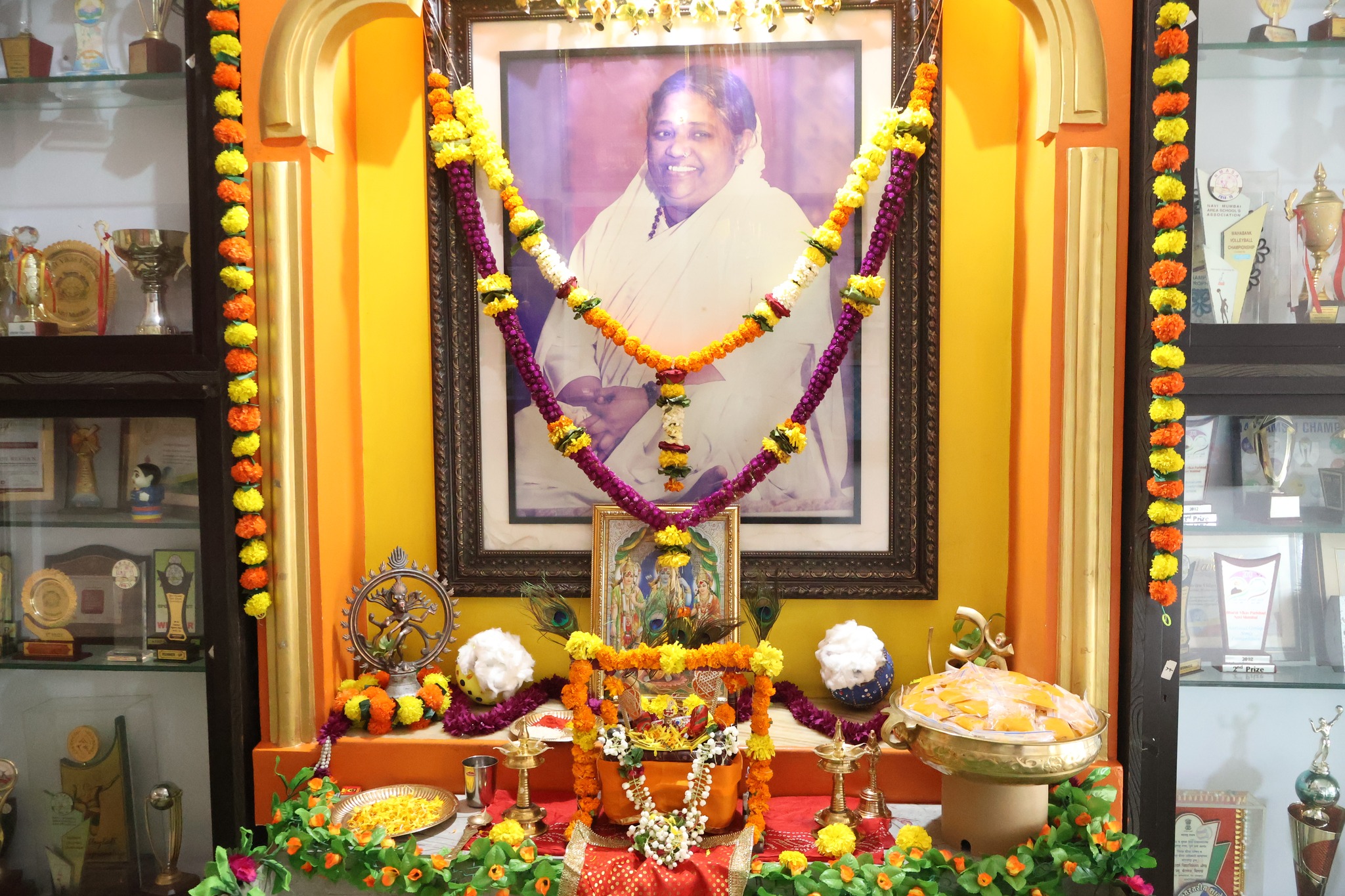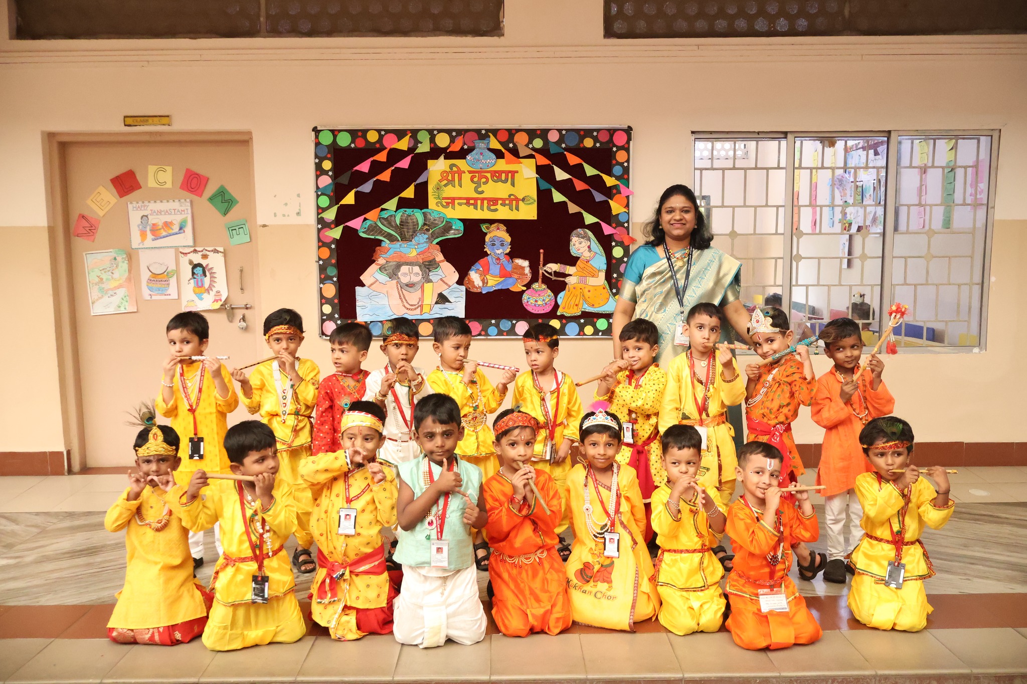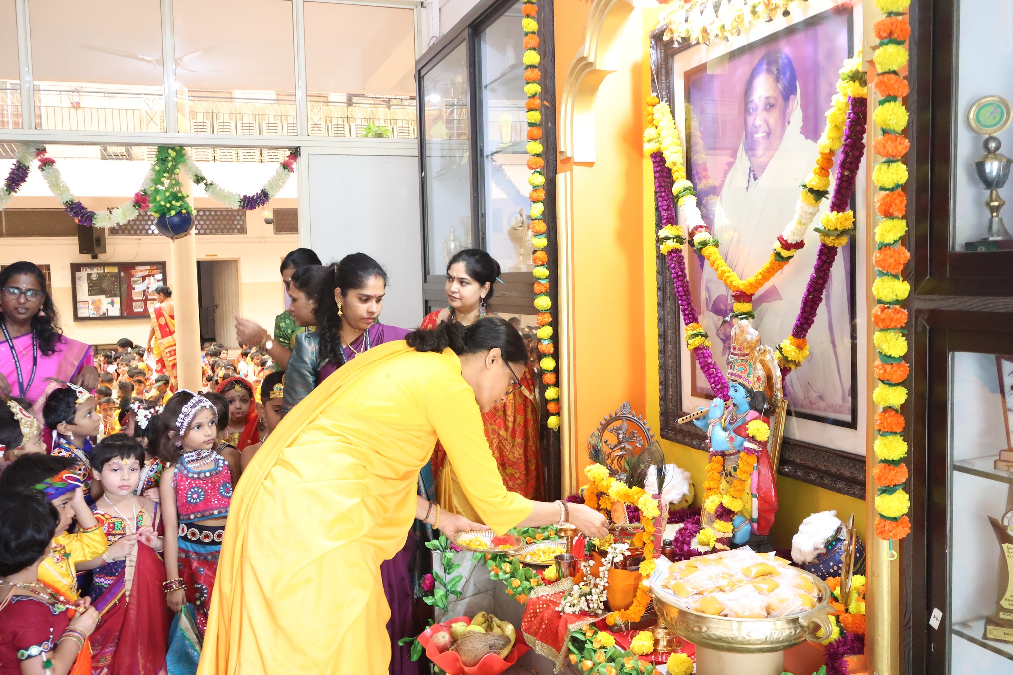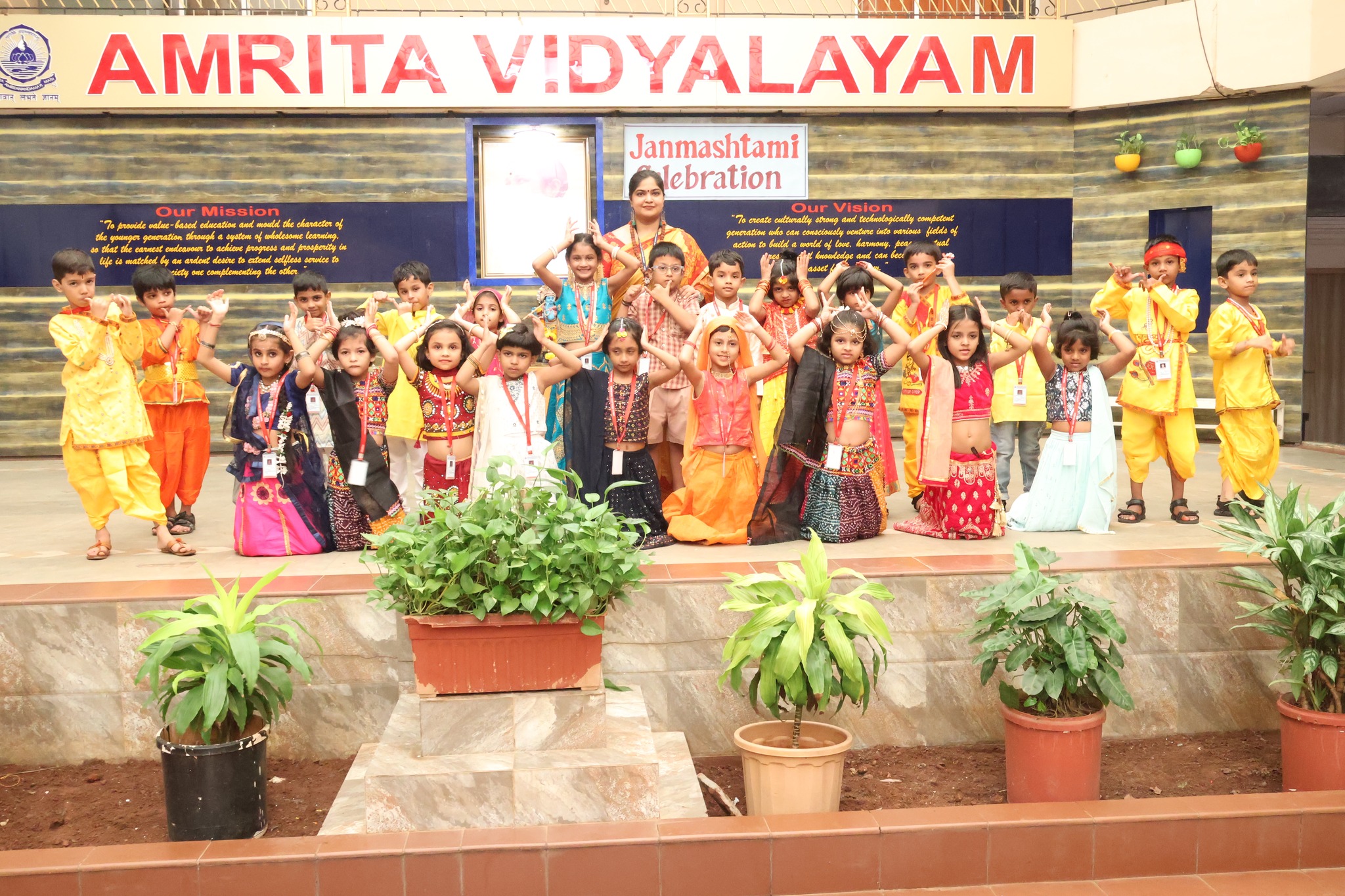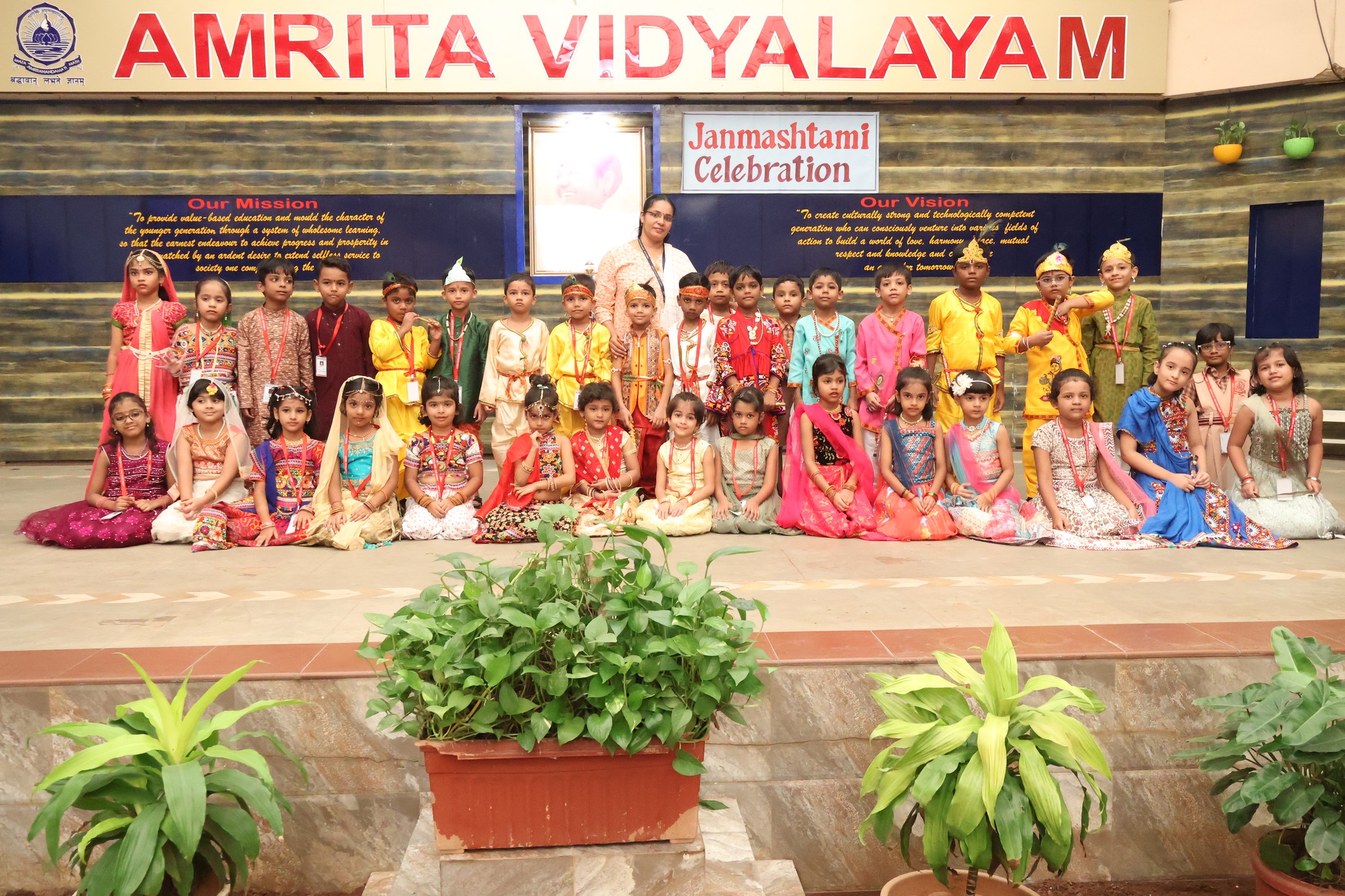 KRISHNA JANAMASHTAMI Through selfless service, you will always be fruitful and will find the fulfillment of your desires. – KRISHNA A true friend, a great guide and the biggest protector – our very own ‘Kanha’ was born on a dark starry night. Celebration of Krishna’s birth is an important affair for all of us and students of Amrita Nursery and Grade 1 and 2 could not hold back from celebrating it. Cladded in their best traditional attire, the gopas and gopis walked into their classrooms. Various class activities were conducted and the story of little Krishna was narrated by the respective class teachers. The floral decoration was made to welcome Ladoo Gopal and school Administrator Brni. Sharanyamritaji lit the lamp, fed him with maakhan and prasadam. Teachers and students sang the Krishna aarti and bhajans with lot of love and devotion. The school quadrangle resonated with high energy as everyone then danced their heart out to the tunes of Krishna songs. #avnavimumbai #janmashtami