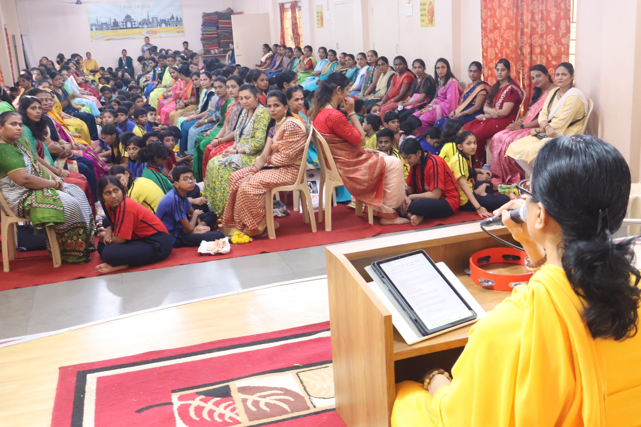 Our Administrator Ma’am , Brni. Sharanyamrita Chaitanya ji initiated the program by emphasizing the profound significance of a mother’s role in our lives. She beautifully connected the mother-child relationship with spiritual values, sharing insightful stories that inspired students to strengthen their bond with their mothers. Following this, melodious bhajans were sung, filling the environment with devotion.