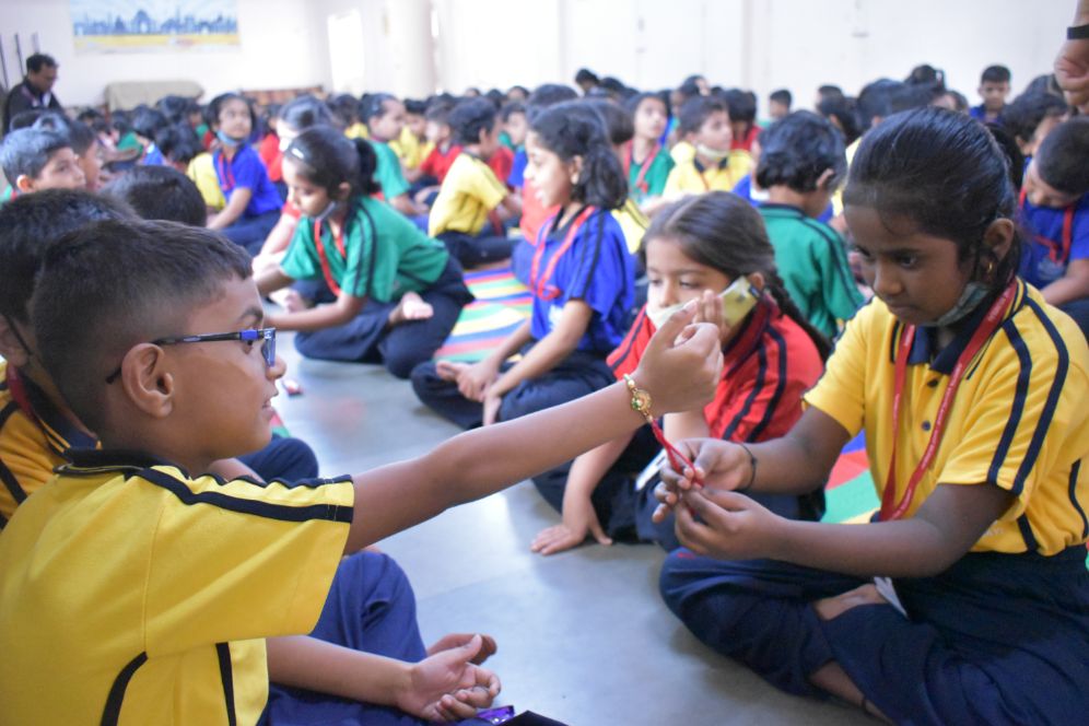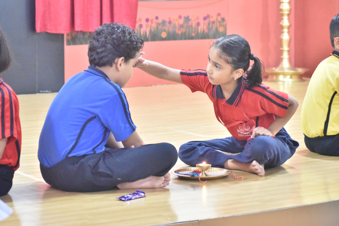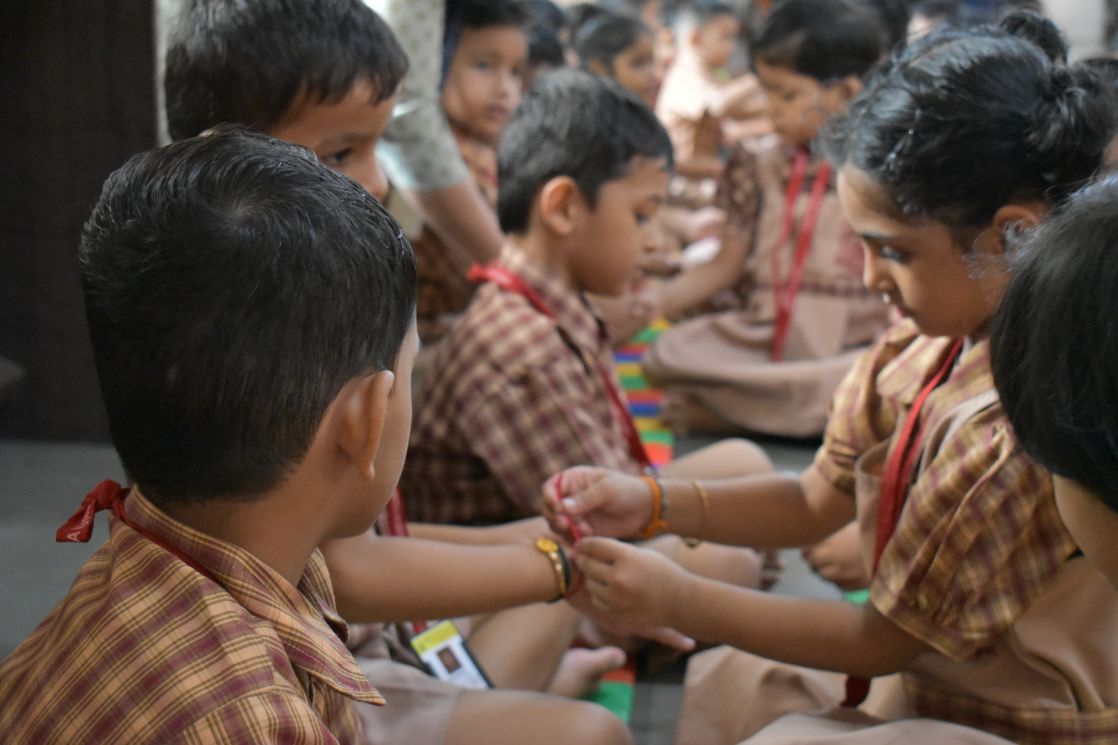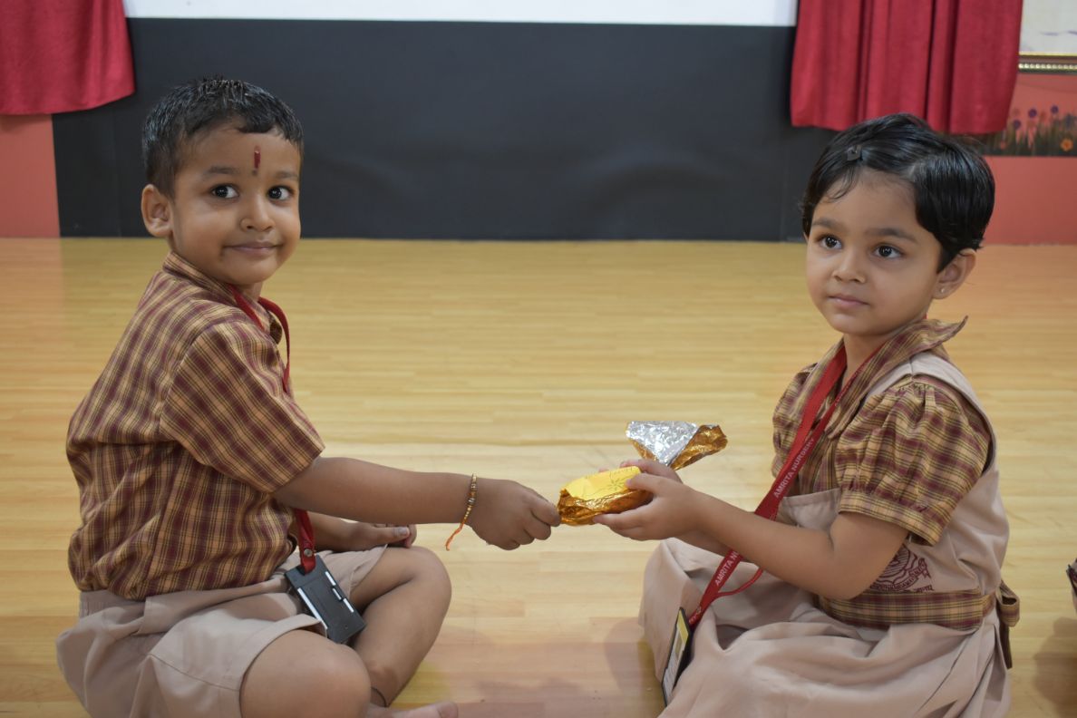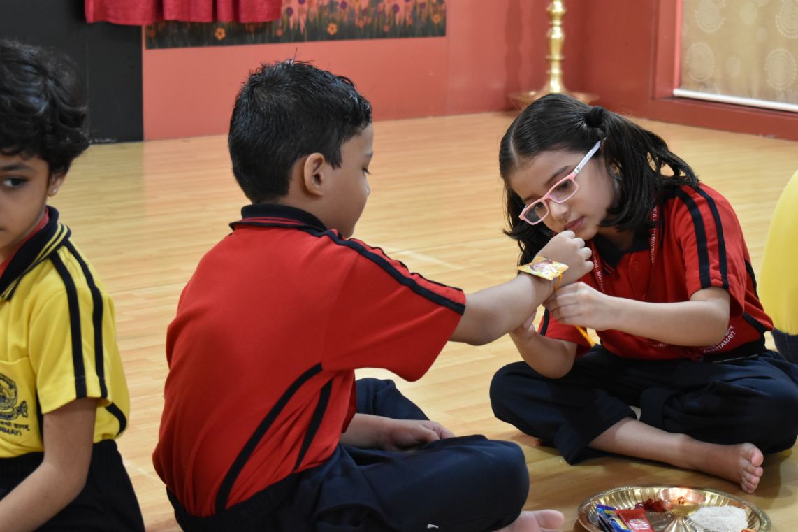 Classes from pre-primary to Grade 4 were gather in auditorium for Rakhi –tying celebration. While Girls tied Rakhi on the wrist of boys, the boys gave