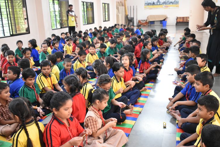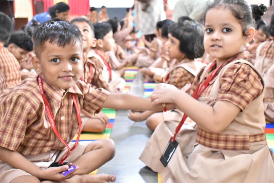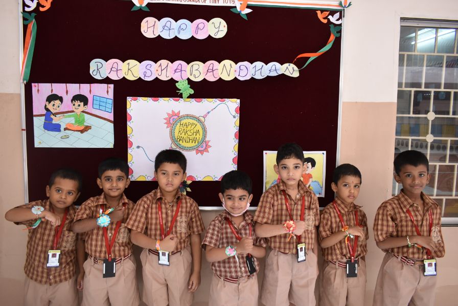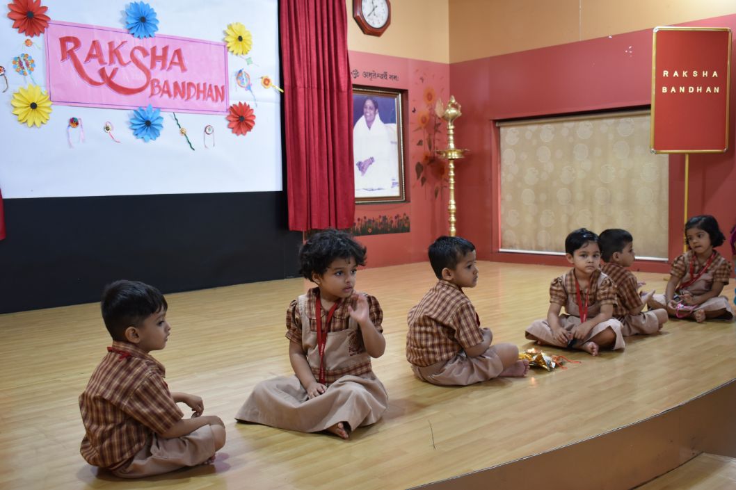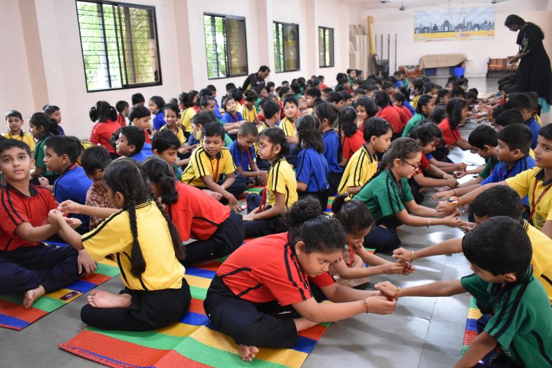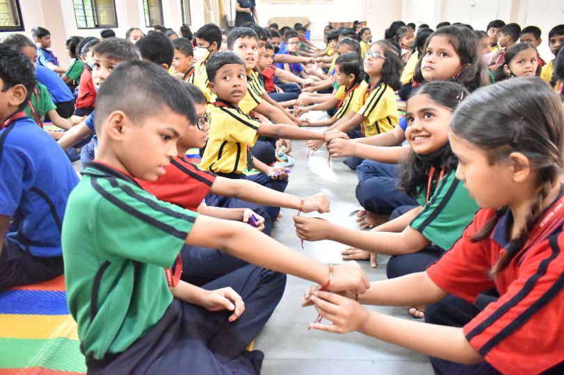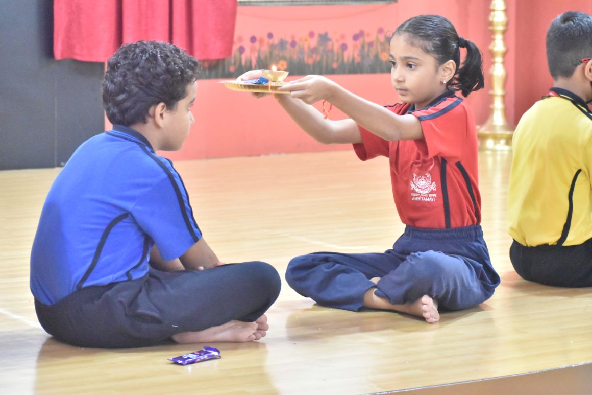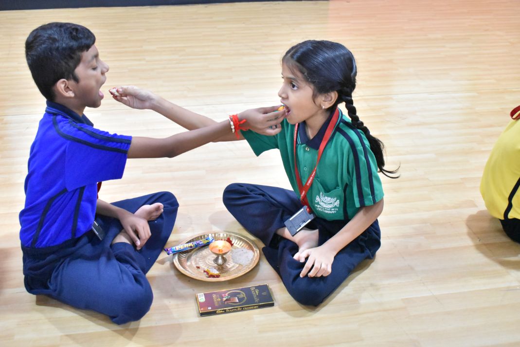 Classes from pre-primary to Grade 4 were gather in auditorium for Rakhi –tying celebration. While Girls tied Rakhi on the wrist of boys, the boys gave